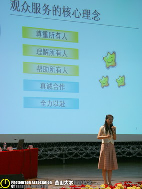 北京奥组委观众服务处副处长张莉、北京奥组委观众服务处项目官员冼毅、刘忠华、帅义刚四位老师为大家进行了一天的培训。张莉老师以她丰富的工作经验为大家讲解了在观众服务中遇到的种种问题及解决问题的办法;冼毅老师用幽默的授课方式为我们带来了丰富而有意义的专业课程,并带领志愿者们进行了模拟练习;刘忠华老师分别为志愿者们进行了检票员、安检、引导员的岗位专业志愿者培训;帅义刚老师对安检协查员的工作进行了细致的讲解,内容繁杂而富于挑战性;为了使观众安全、快速、愉悦地通过安检,志愿者必须要学会微笑服务,并承受巨大的心理压力和体能考验。面对因受到某些限制不能将物品带入赛场的观众,志愿者要善于倾听并努力缓和他们激动的情绪,确保整体工作的顺利进行。
