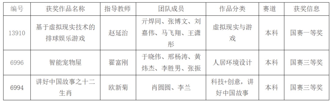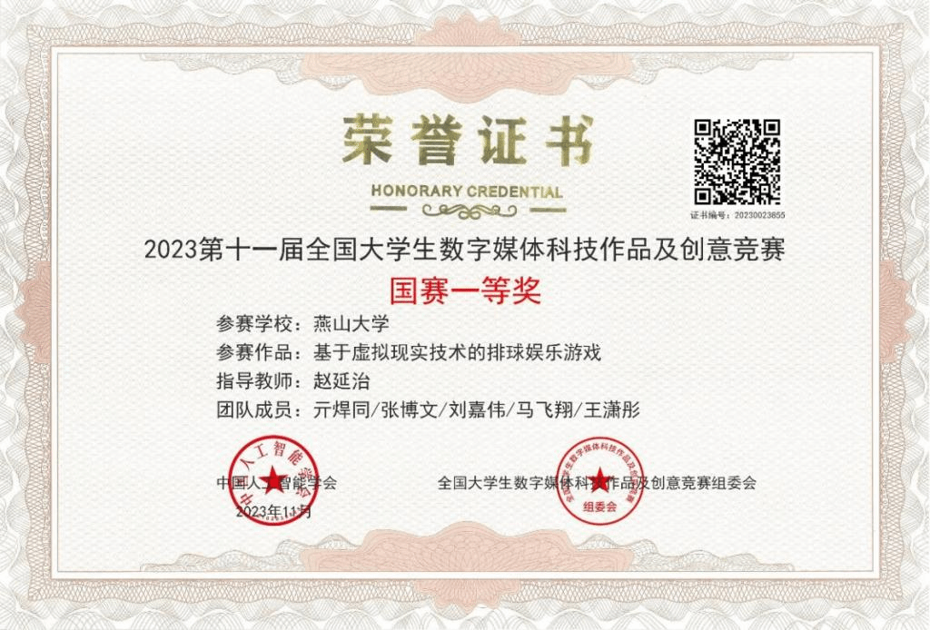 其中,由赵延治教授指导,亓焊同、张博文、刘嘉伟等同学开发的作品《基于虚拟现实技术的排球娱乐游戏》在第十一届全国大学生数字媒体科技作品及创意竞赛全国现场总决赛中脱颖而出,斩获国赛一等奖和优秀指导教师奖。