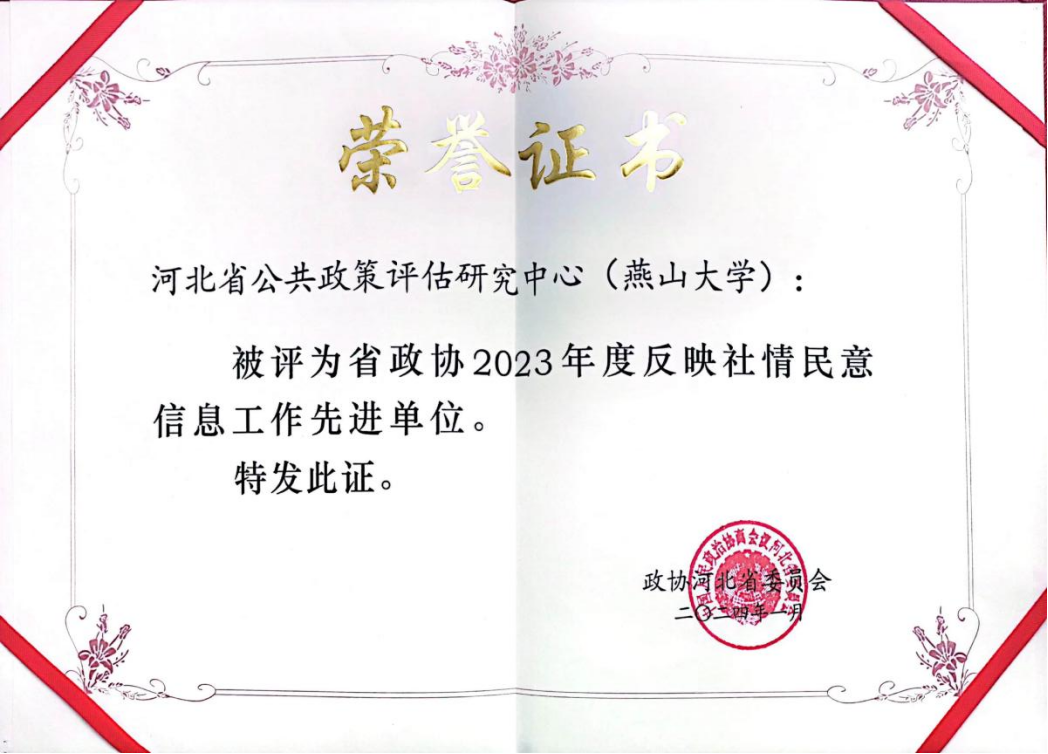 【新闻中心讯】近日,燕山大学新型智库“河北省公共政策评估研究中心”被评为河北省政协2023年度反映社情民意信息工作先进单位。