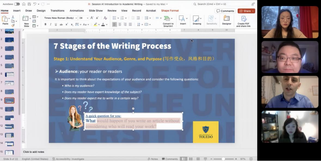 【新闻中心讯】3月19日,我校联合传统友好学校美国托列多大学开设的研究生英文乐竞体育在线写作与研究线上课程顺利开课。该课程旨在提升我校研究生的英文乐竞体育在线写作与研究能力,推进“卓越人才国际化培育计划”,培养更多具有“家国情怀、国际视野和全球竞争力”的国际化人才。