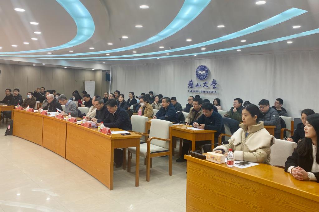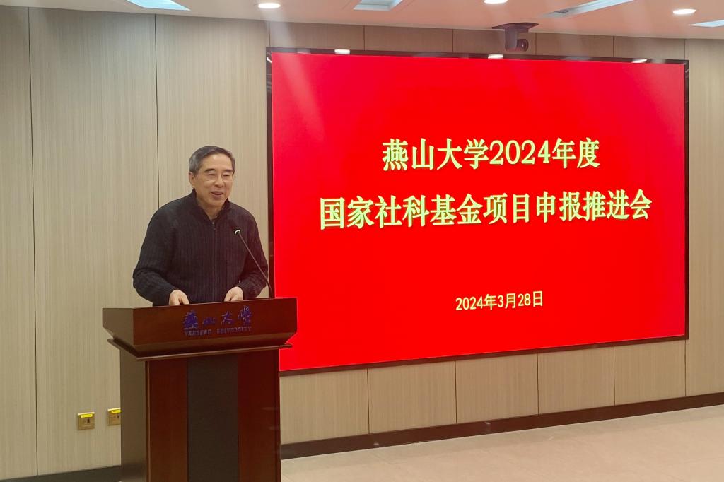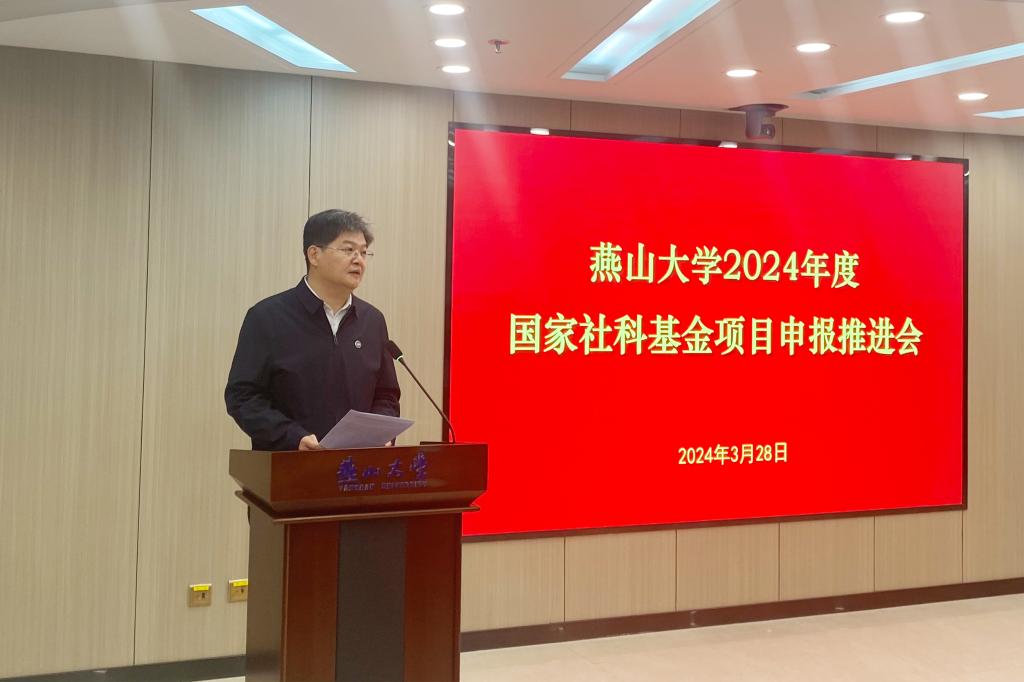 【新闻中心讯】3月28日,燕山大学2024年度国家社科基金项目申报推进会在世纪楼1816会议室召开。燕山大学党委常委、副校长汪殿龙出席会议,各文科学院科研副院长、2024年国家社科基金项目拟申报人员和社会科学处全体成员共60余人参加了会议。会议邀请来自中国现代国际关系研究院、中国科学院文献情报中心、中国传媒大学、北京师范大学、北京体育大学、中国政法大学、北京外国语大学、中央团校(中国青年政治学院)、中国宏观经济研究院(国家发展和改革委员会宏观经济研究院)等知名高校、研究机构的9位专家为我校教师进行一对一申报辅导(其中2位专家线上指导)。会议由社会科学处处长周高仪主持。