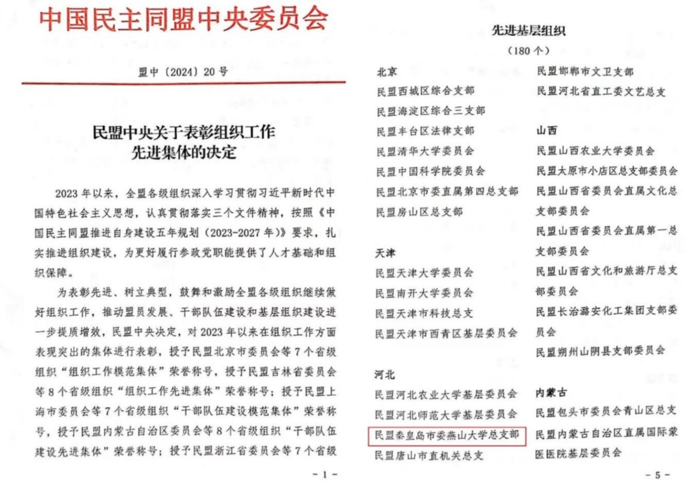 【新闻中心讯】近日,从中国民主同盟组织工作会议传来喜讯,民盟秦皇岛市委燕山大学总支部从河北省百余个民盟基层组织中脱颖而出,被民盟中央授予“先进基层组织”荣誉称号。