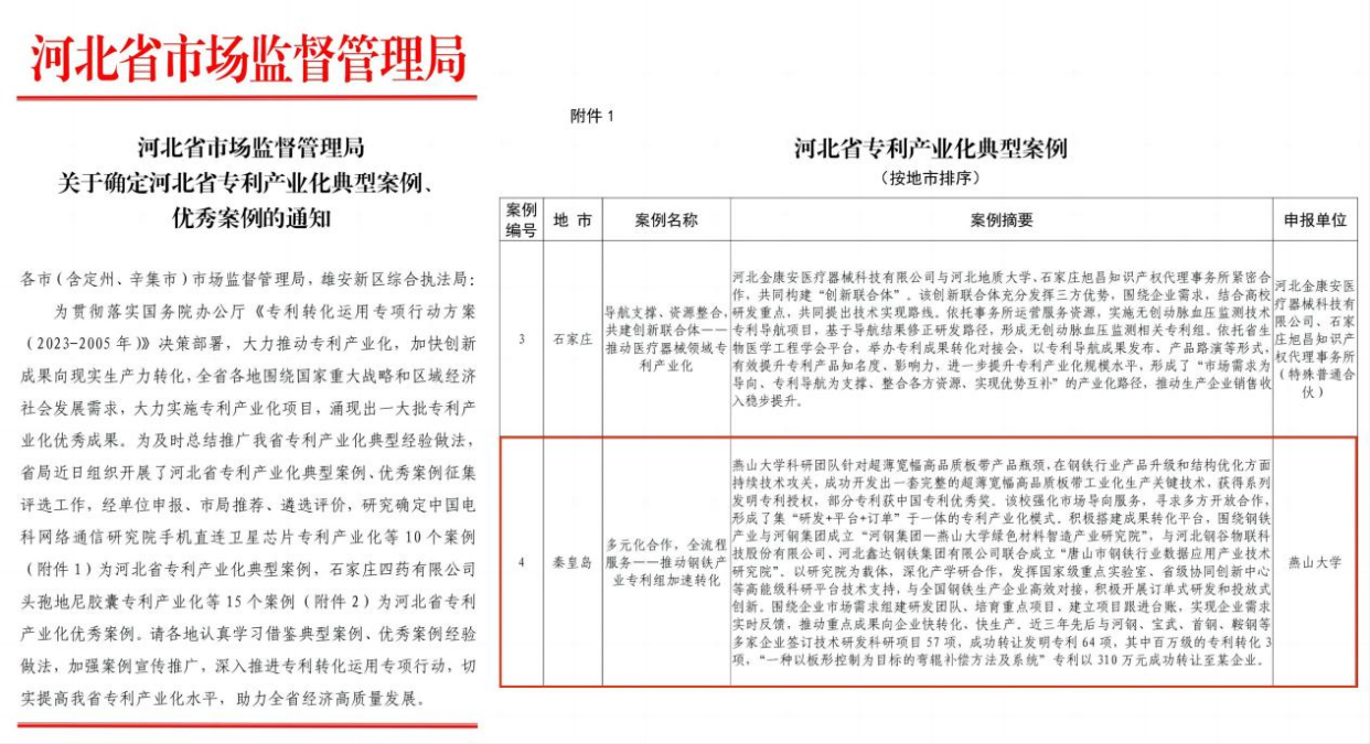 【新闻中心讯】为贯彻落实国务院办公厅《专利转化运用专项行动方案(2023-2025 年)》决策部署,大力推动专利产业化,加快创新成果向现实生产力转化,2024年4月25日,河北省知识产权局首次发布全省专利产业化十大典型案例和15个优秀案例。燕山大学申报的“多元化合作、全流程服务——推动钢铁产业专利组加速转化”成功入选河北省专利产业化十大典型案例。