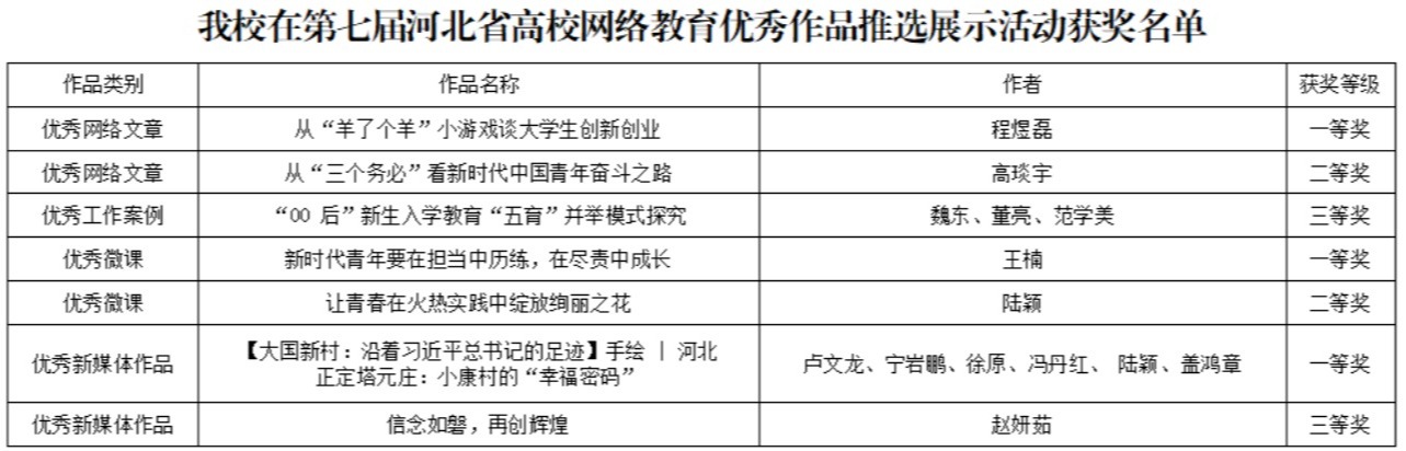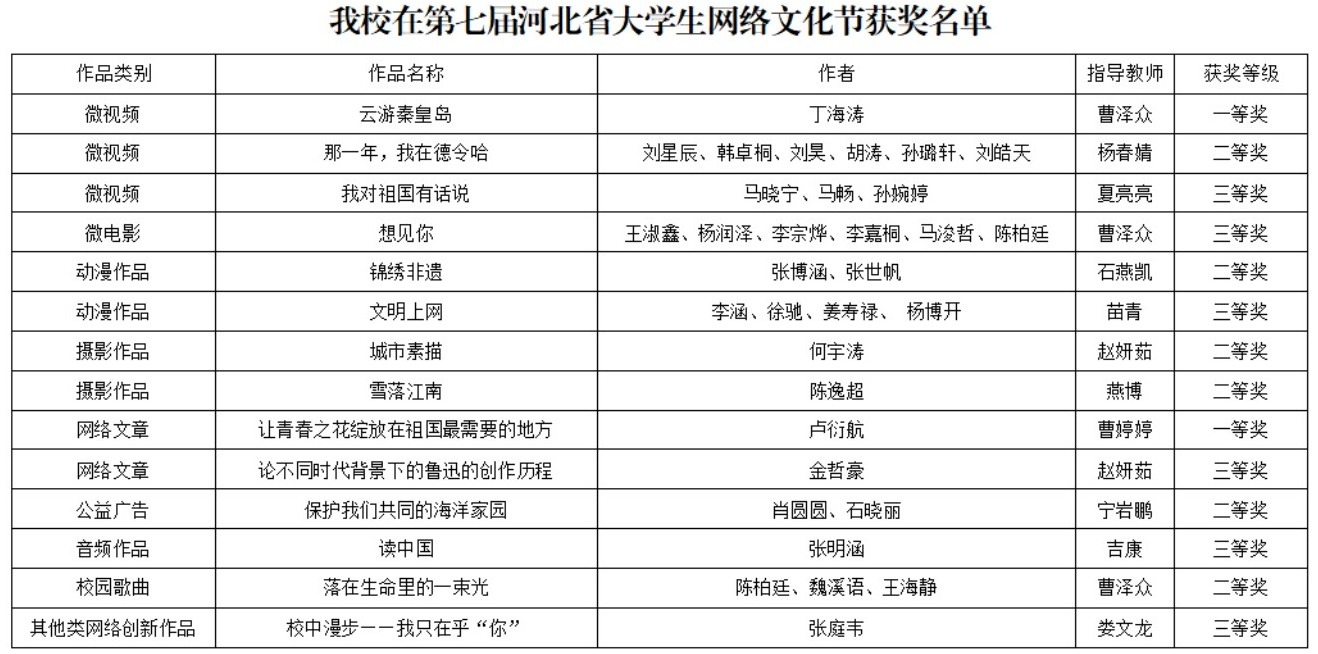 【新闻中心讯】近日,河北省教育厅、中共河北省委网信办公布了第七届河北省大学生网络文化节和高校网络教育优秀作品推选展示活动遴选结果,我校21项优秀作品获奖。在大学生网络文化节作品评选中,我校获奖作品共计14项,其中一等奖2项、二等奖6项、三等奖6项;在高校网络教育优秀作品评选中,我校获奖作品共计7项,其中一等奖3项、二等奖2项、三等奖2项。获奖作品数量居全省首位。燕山大学获河北省大学生网络文化节和高校网络教育优秀作品推选展示活动优秀组织奖。