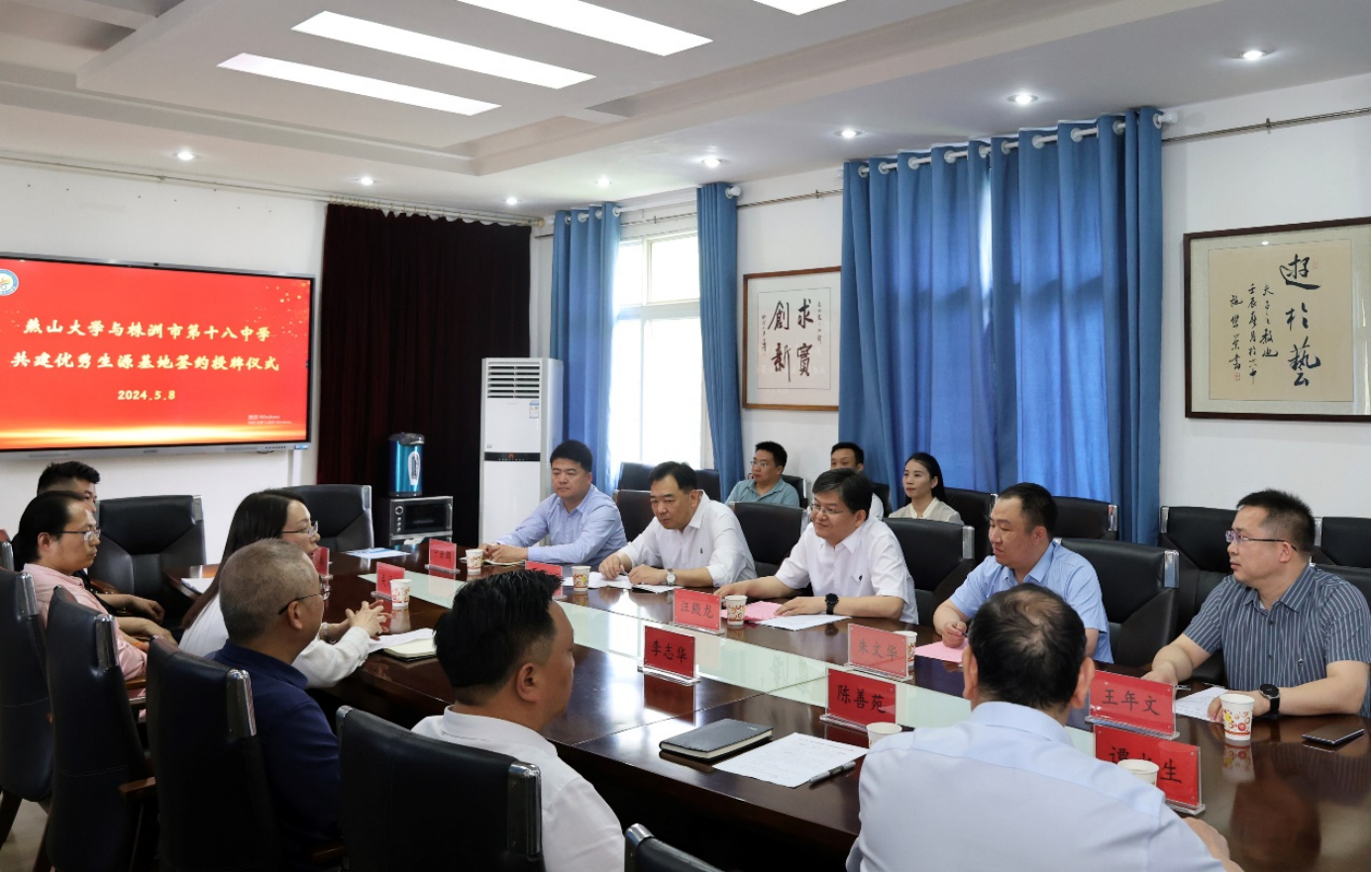 在走访高中阶段,汪殿龙一行与中学校领导、骨干教师进行座谈交流,并分别向株洲市第十八中学、长沙市明达中学授予“优秀生源基地”牌匾。座谈会上,汪殿龙首先介绍了学校的历史沿革和近年来在人才培养、学科建设、科学研究等方面取得的新进展,交流了往年被我校录取学生的学习成长近况,对两所特色中学取得的办学成就给予充分肯定和高度评价。他表示,高中作为基础教育的关键时期,高校作为人才创新能力和职业能力培养的关键阶段,高中高校对于构建全方位、全过程的立德树人体系具有义不容辞的责任;优秀生源基地共建,是促进高校和中学人才交流互动、优化人才输送和选拔机制的有效举措。在招生宣讲阶段,招生就业处副处长朱文华、艺术与设计学院副院长王年文向高中学子们分别对招生政策、艺术学科的发展做了深入的解读。