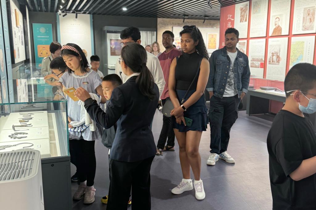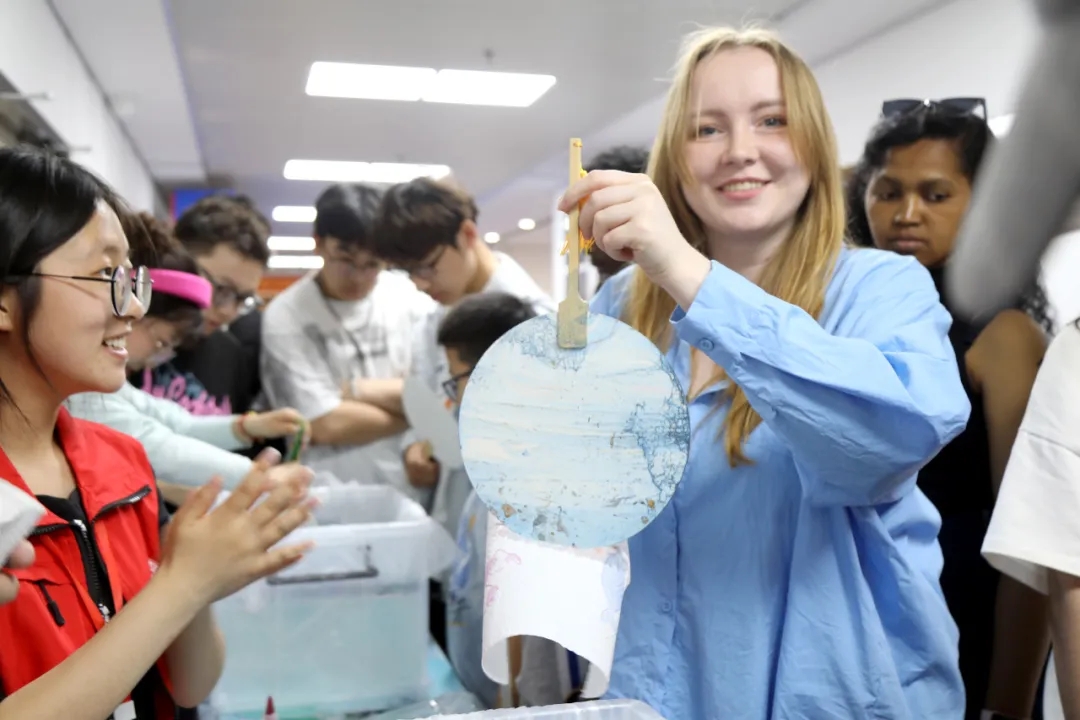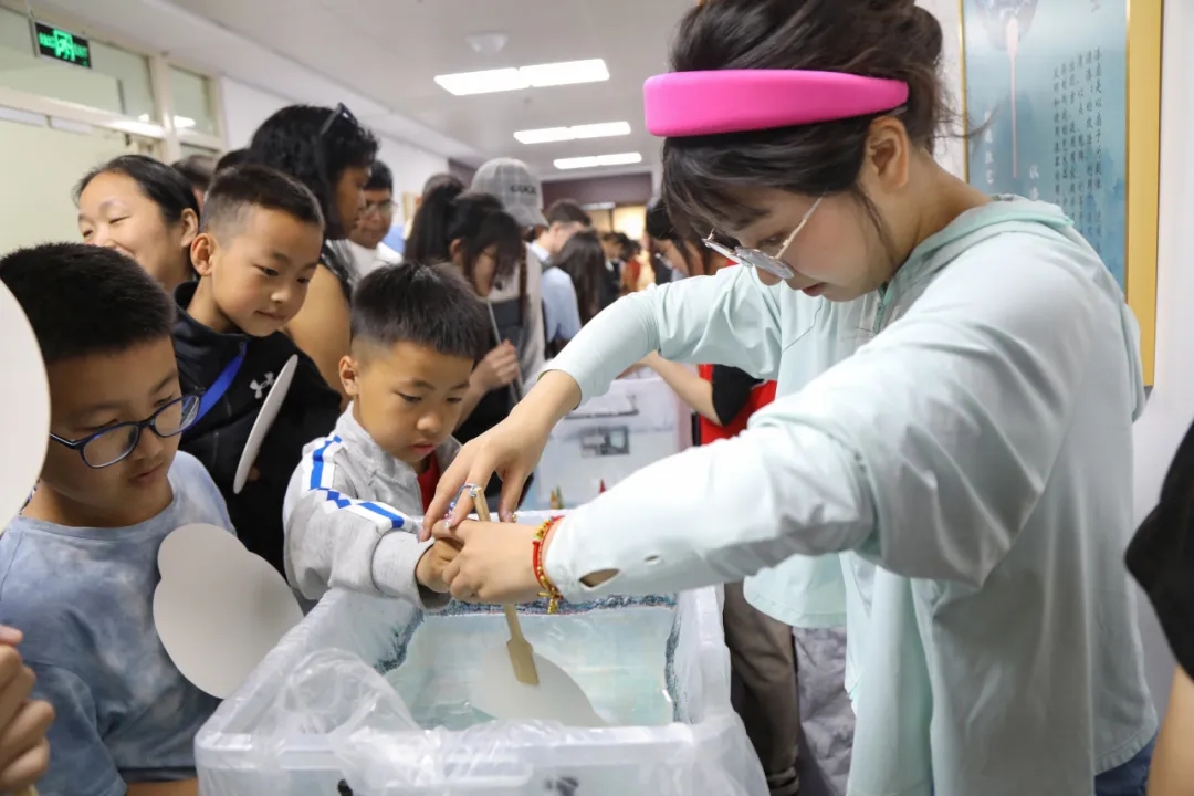 在博物馆展厅中,很多人带着孩子参观。有的驻足文物前细细观赏,有的在寻找“假如文物会说话”趣味问答题上的答案,有的在馆里盖与通馆文牒里相对应的文物印章,还有人与身穿民族服装的讲解员拍照留念。在研学教室里,“考古人员”开盲盒、挖文物,只见他们将土块表面用水润湿,拿起洛阳铲,层层挖土……亲手挖掘的过程激起了大家对文物的强烈兴趣。在文博市集,不仅有燕大元素印章、风景套色印章、火漆印章等文创产品,还可以现场制作非遗漆扇。一群参观博物馆的外国留学生对文博市集尤其是非遗漆扇兴趣浓厚,纷纷表示今天沉浸式感受和体验到了中国传统文化的独特魅力。