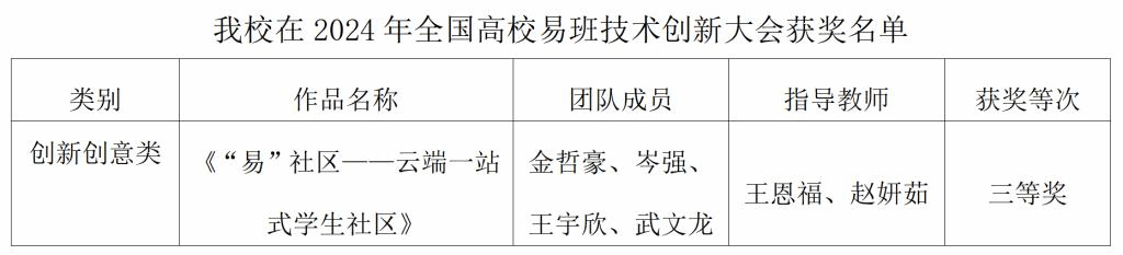 【新闻中心讯】近日,2024年度易班技术创新大会在海南陵水黎安国际教育创新试验区举行,我校作品《“易”社区——云端一站式学生社区》在创新创意类赛道众多参赛作品中脱颖而出,荣获全国三等奖。