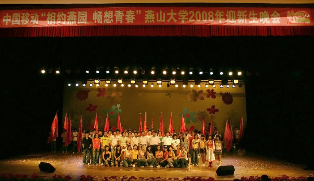 【新闻中心讯】9月10日晚7时,由共青团燕山大学委员会、燕山大学学生会主办的“相约燕园,畅想青春”燕山大学2008年迎新生晚会,在东校区大学生活动中心举行,室外同时直播。校长助理韩德才、党委宣传部部长白靖、学生工作处处长张景超、海军驻燕山大学后备军官选拔培养办公室主任何宗发、团委书记蔡大勇,以及各院系主管学生工作的领导出席了本场晚会。