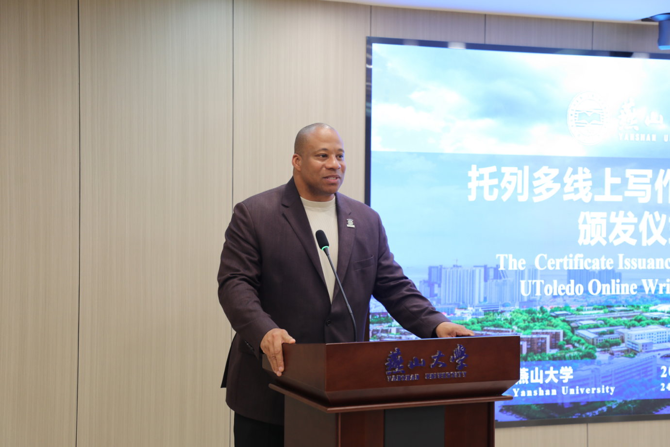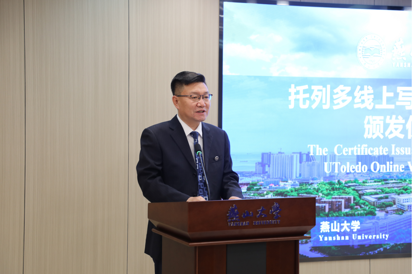 【新闻中心讯】6月4日下午,托列多大学线上英文乐竞体育在线写作与研究课程结课暨证书颁发仪式在世纪楼1816室举行,托列多大学副校长萨米·斯潘(Sammy Spann)、托列多大学国际学生项目中心主任于心任、燕山大学党委常委、副校长陈国强出席,活动由国际合作处处长陆军主持。