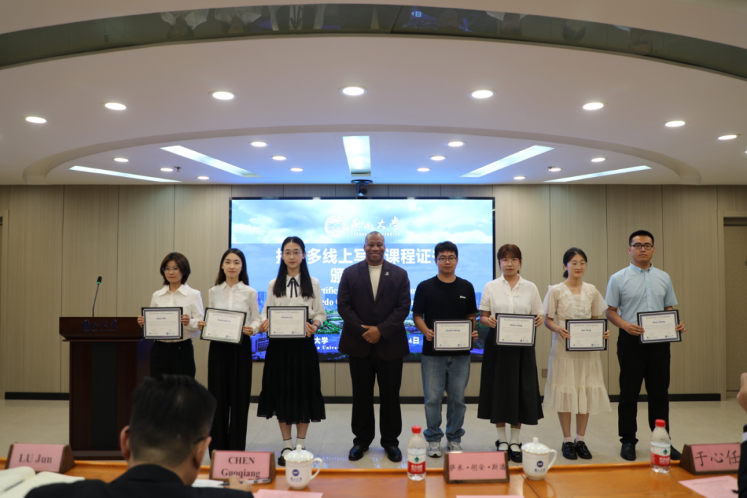 萨米·斯潘发表了热情洋溢的致辞并亲自为学员颁发证书。他对学员的努力和成就表示了衷心的祝贺,并强调了乐竞体育在线写作在国际化交流中的重要性。陈国强对学员表示了肯定与赞赏,也表达了对托列多大学教学团队和支持线上课程的老师、工作人员的感谢,并对两校之间的合作表示了高度赞赏和期待,希望未来能够继续深化合作,共同培养更多国际化人才。