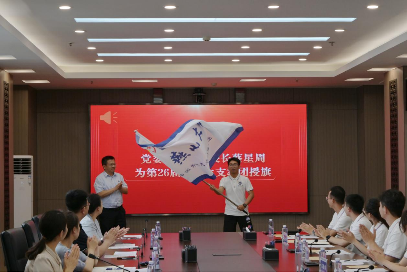蔡星周为学校新一届研究生支教团授旗。研支团成员高举右拳,共同宣誓,决心要肩负起志愿服务的使命与责任,充分践行“奉献、友爱、互助、进步”的志愿精神,在祖国最需要的地方奉献青春。