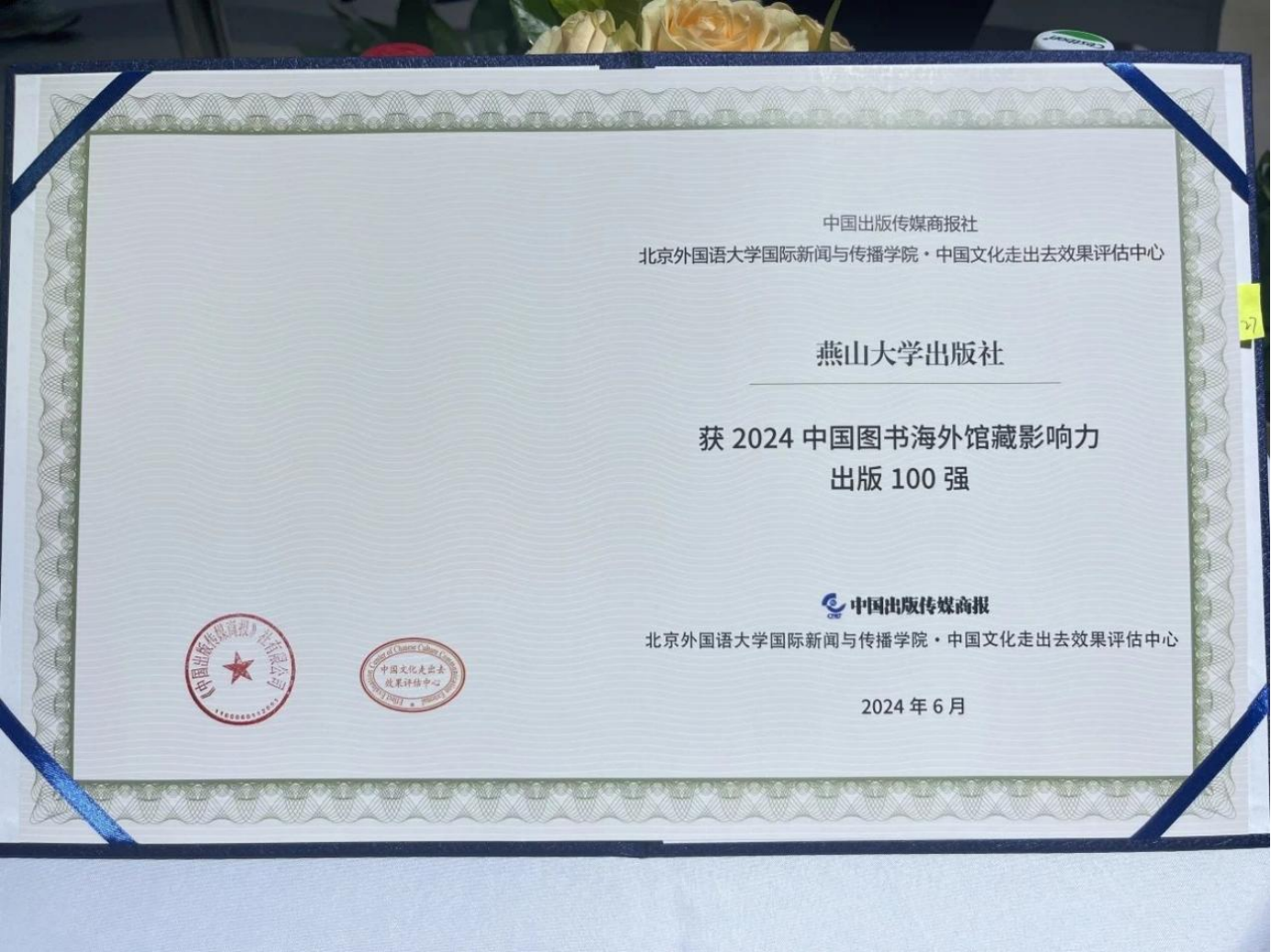 【新闻中心讯】近日,2024年度“中国图书海外馆藏影响力研究报告”在第30届北京国际图书博览会上正式发布。燕山大学出版社排名第94位,连续三年入选“中国图书海外馆藏影响力出版100强”,是本次入选百强的92家大学社之一。