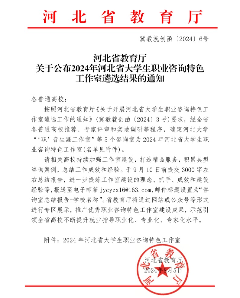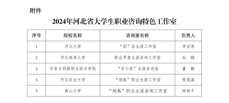 【新闻中心讯】近日,河北省教育厅公布了2024年河北省大学生职业咨询特色工作室遴选结果,经过学校申报、省教育厅组织专家评审和实地考察遴选等环节,燕山大学“翔燕”职业生涯咨询工作室获评2024年河北省大学生职业咨询特色工作室。本年度,全省共有5所高校的特色工作室入选。