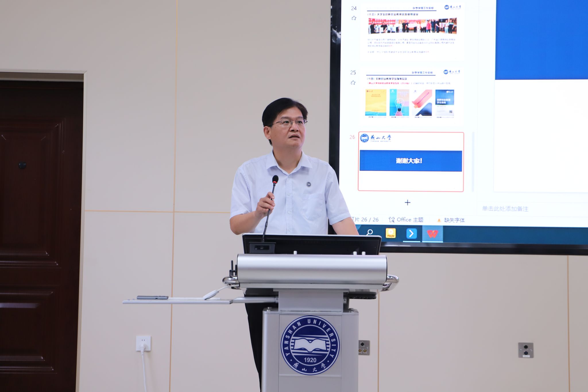 会上,赵春梅对学校部分本科教学数据进行了通报,重点解读了《本科教学状态数据分析报告》(2023年)、《教师教学与发展评价报告》和《学生学习体验与成长评价报告》(2022-2023学年),同时通报了2024年春季学期以来教师教学竞赛和教学资源建设成绩,并对2024年秋季学期本科教学重点工作进行了部署安排,涵盖教学运行、教学建设、质量保障、教学改革、师资建设和教学资源建设等方面。创新创业教育与指导中心主任张杨介绍了我校创新创业教育整体工作推进思路,通报了2024年春季学期创新创业教育主要工作,对2024年秋季学期国家级创新创业学院建设、本科生创新创业教育学分管理、大学生创新训练计划管理、一类创新创业竞赛组织管理、品牌活动建设、大学生创新创业实践基地建设等创新创业教育重点工作做了部署安排。