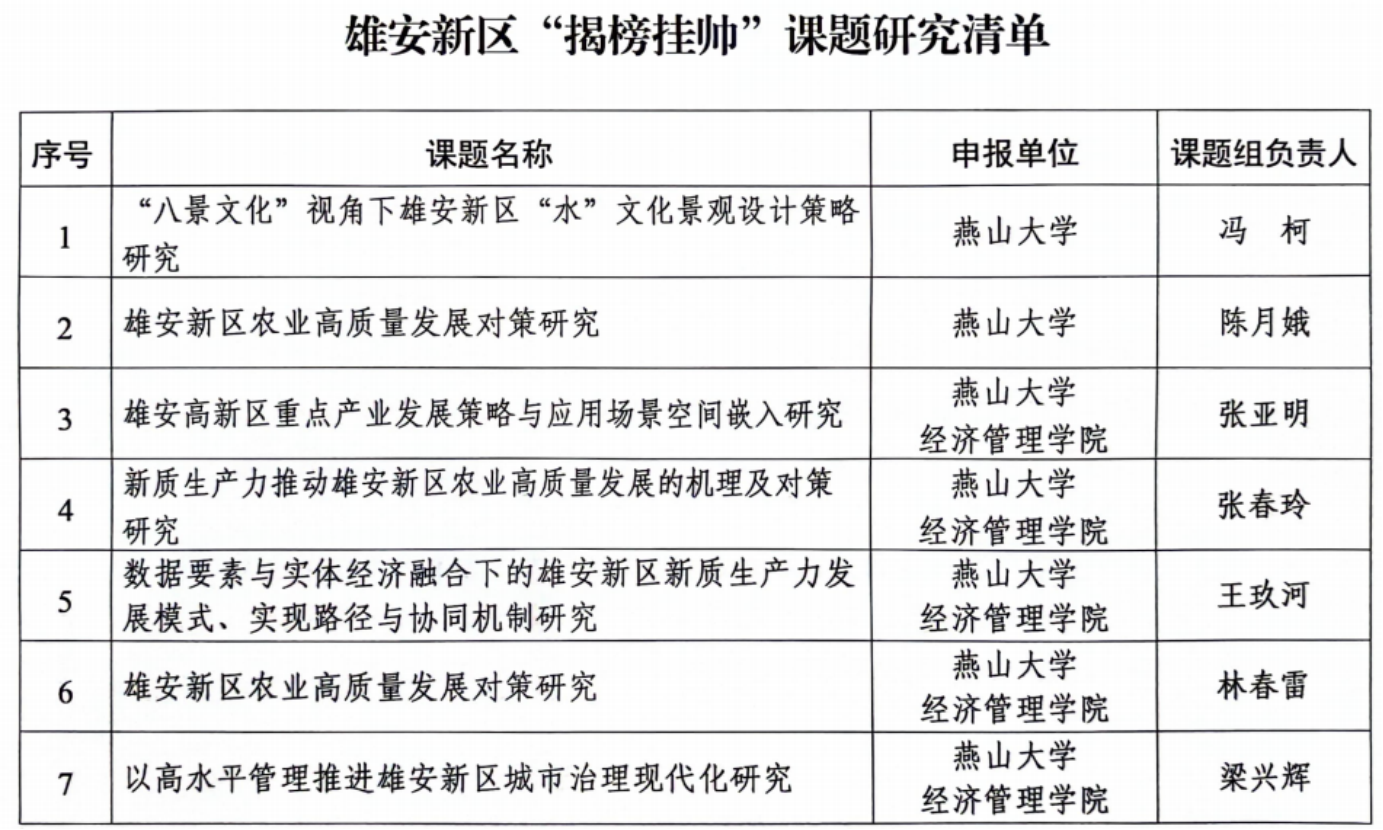 【新闻中心讯】近日,河北雄安新区党政办公室公布了2024年度雄安新区“揭榜挂帅”课题研究的立项结果,燕山大学共有11项研究课题进入“践榜”环节。