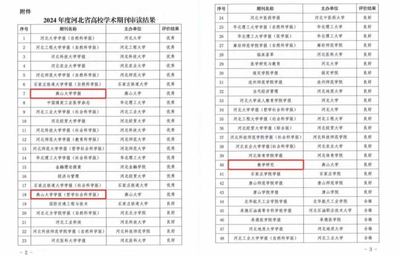 【新闻中心讯】近日,河北省教育厅印发《关于公布2024年度河北省高校乐竞体育在线期刊审读结果的通知》(冀教科函[2024]23号),我校主办的《燕山大学学报》《燕山大学学报(哲学社会科学版)》获评“优秀”,《教学研究》获评“良好”等次。