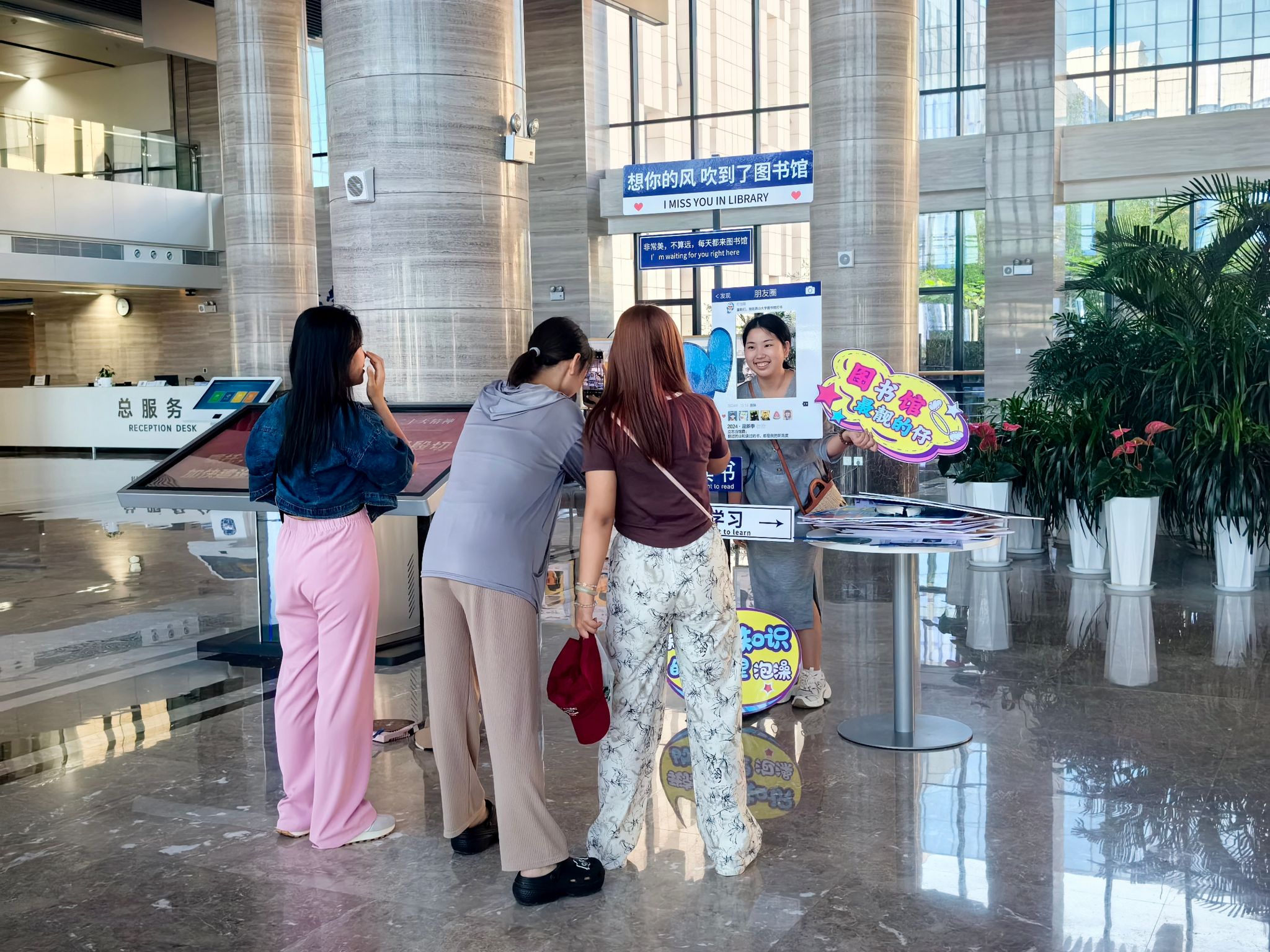 为做好迎新期间各项活动安排,图书馆高度重视,做实做细迎新季活动筹备工作。随着新生络绎不绝地来到图书馆前,馆外台阶和馆内LED屏幕上早已布置了欢迎标语,浓厚的迎新氛围在图书馆周边热情聚拢。在图书馆正门和北门设置的迎新咨询驿站,专门为新生介绍图书馆基本情况和系列迎新活动,发放宣传资料、提供现场咨询,解答新生关于图书馆的各种向往与疑惑。同时还鼓励新生和家长们走进图书馆,体验馆内丰富的藏书、先进的设施和宁静的学习环境,让新生在探索中发现图书馆的独特魅力。