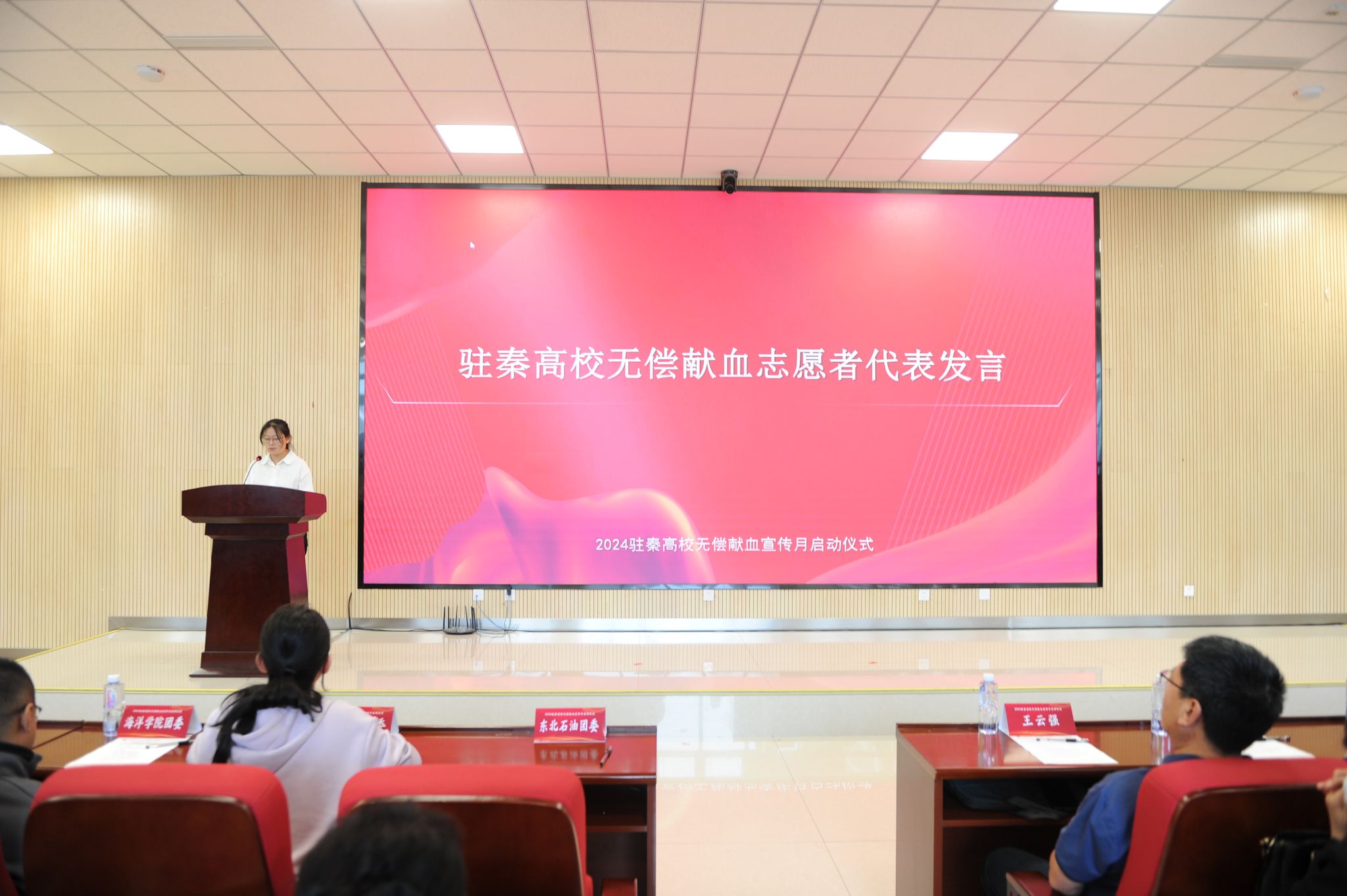 驻秦高校无偿献血志愿者代表、我校青年志愿者协会成员路雅丹发言,从自身志愿服务经历出发,号召各高校青年学子为无偿献血事业贡献青春力量。