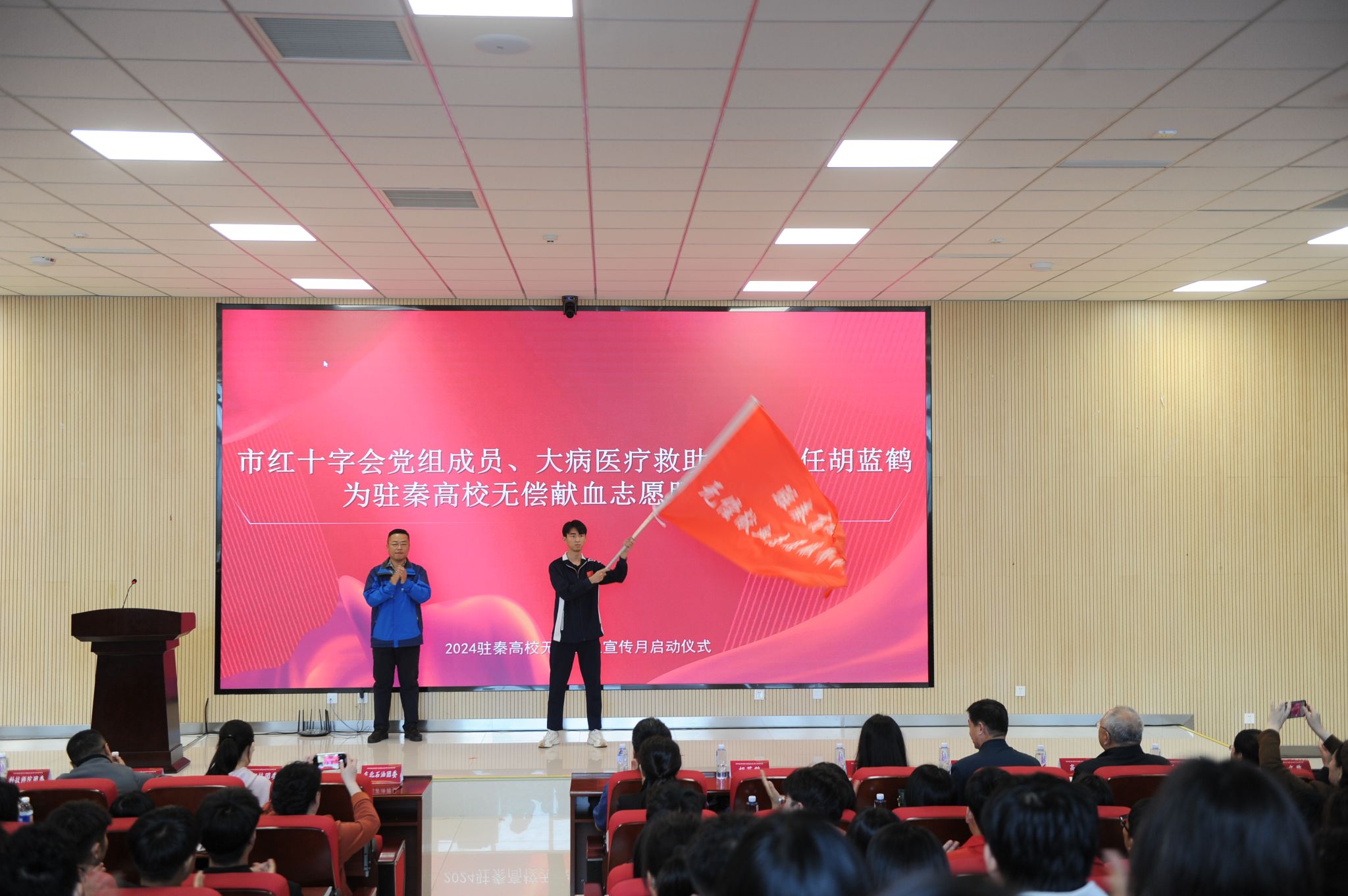 市红十字会党组成员、大病医疗救助中心主任胡蓝鹤为驻秦高校无偿献血志愿服务队的授旗。市文明办专职副主任闫战杰宣布仪式启动。