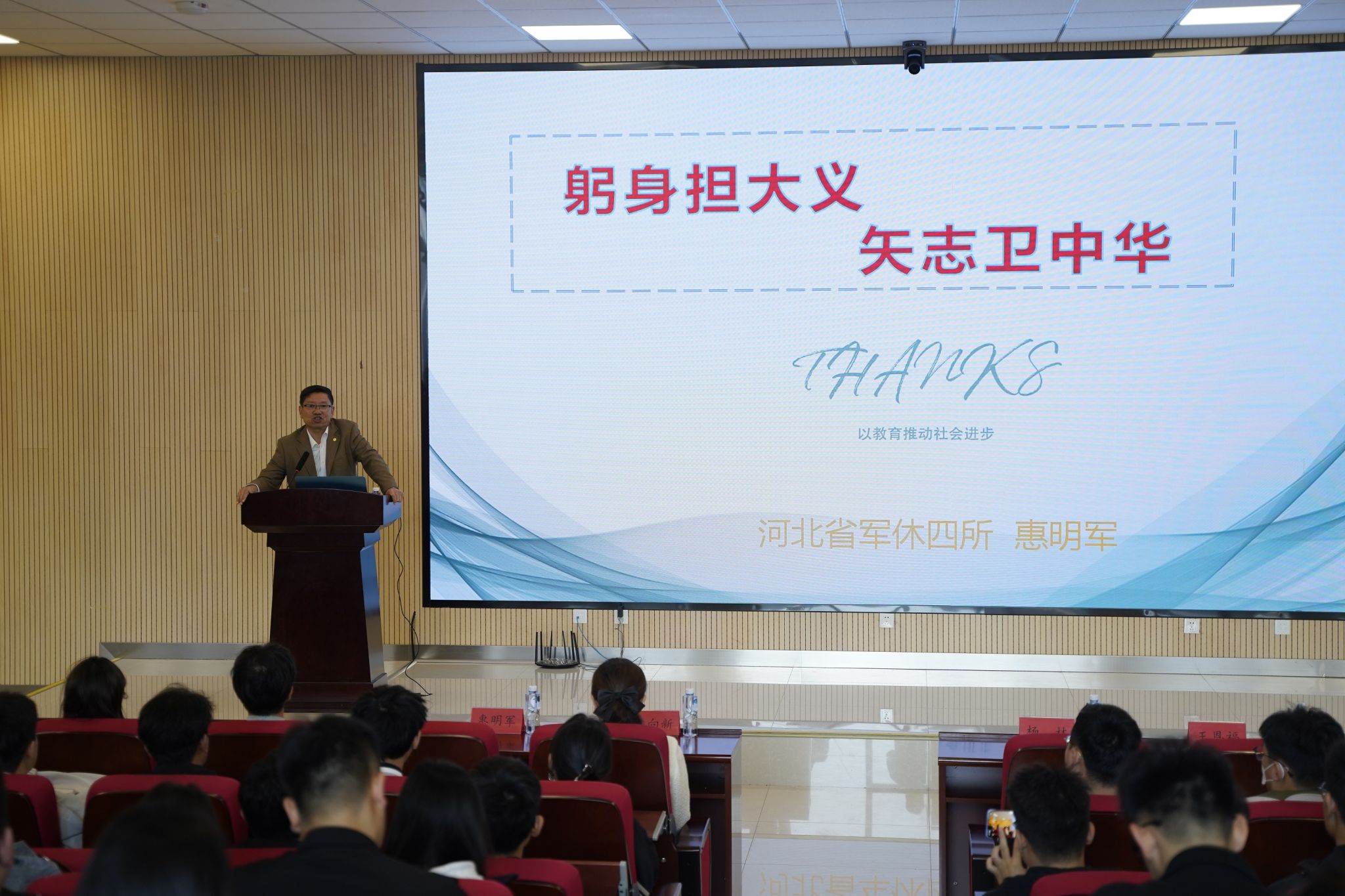 【新闻中心讯】为加强青年学子的国防意识,传承红色基因,激发爱国情怀和强国志向,10月15日上午9:00,我校在西校区信息馆行知报告厅举办了“强军有我筑梦未来 红色基因薪火相传”国防教育进校园专题活动。本次活动由人民武装部、河北省高校网络思想政治工作中心与河北新闻网、河北省军队离退休干部第四休养所联合举办,吸引了200余名师生积极参加。