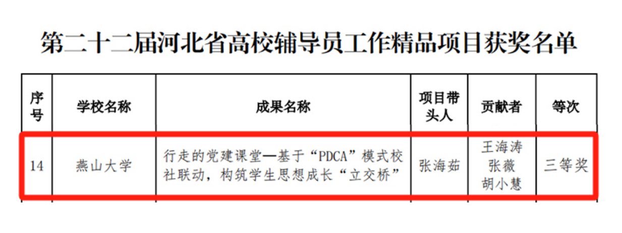 我校在省委宣传部组织的2023年度全省宣传思想文化工作优秀创新案例评选中,获得一等奖一项。在河北省教育厅组织的第二十二届河北省高校思想政治工作成果征集评选中,获得高校校园文化建设优秀成果一等奖一项,三等奖两项;获高校辅导员工作精品项目三等奖一项。
