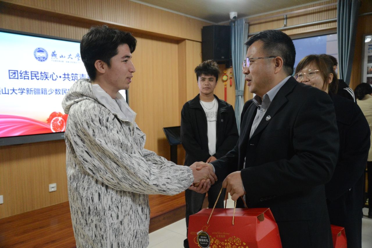 蔡星周代表学校为每位同学赠送了慰问礼品,来自新疆的馕让同学们品尝家乡的味道,感受家的温暖;红红的石榴寓意着同学们要像石榴籽一样紧密团结在一起。一份贴心的礼品承载着学校的期许与祝愿;一次温情的举动,让身处异乡的少数民族学生们感受到了学校的关怀与温暖。