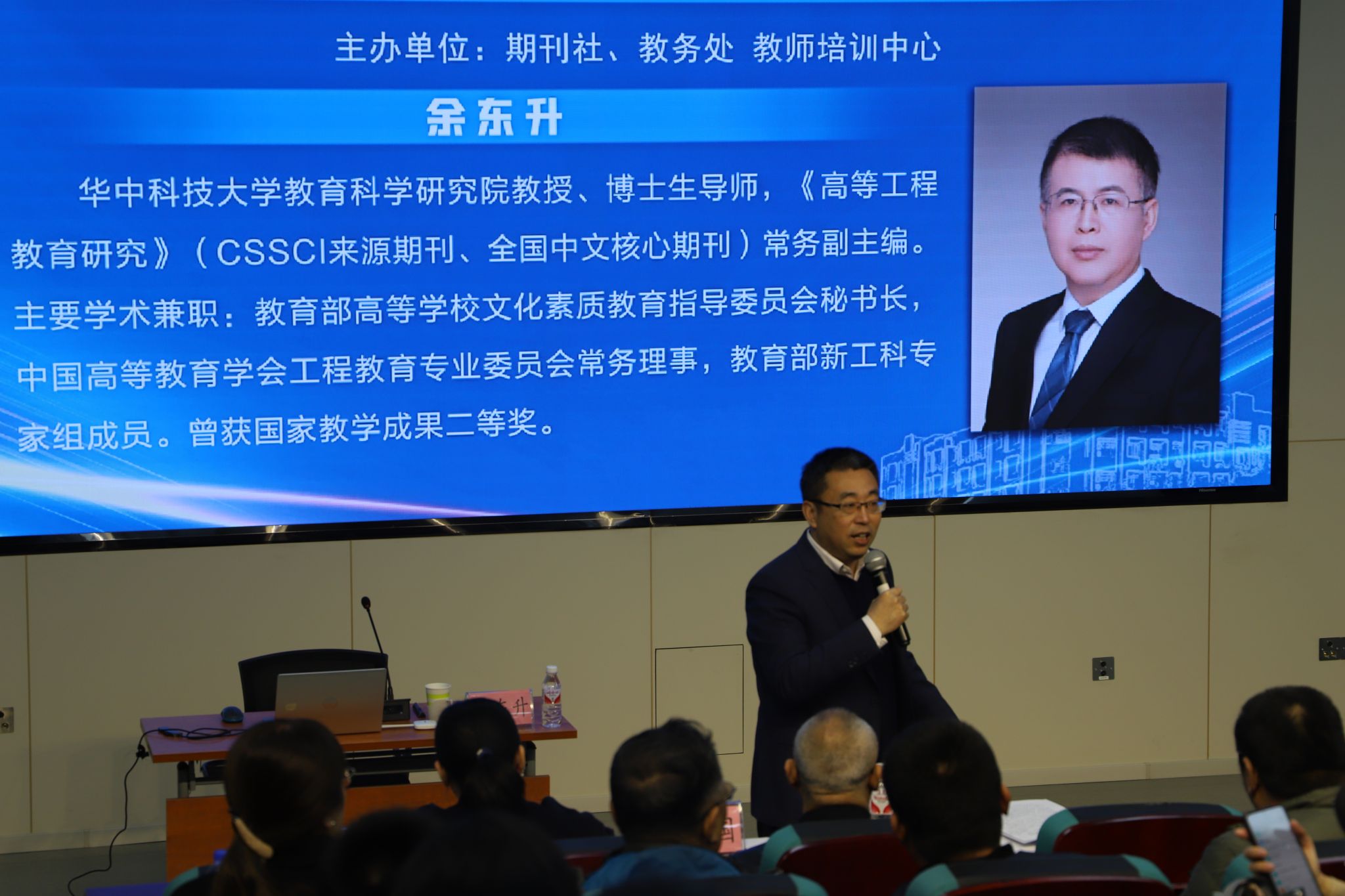 报告主讲人是教育部高等学校文化素质教育指导委员会秘书长、中国高等教育学会工程教育专业委员会常务理事、教育部新工科专家组成员、华中科技大学《高等工程教育研究》常务副主编余东升教授。燕山大学党委常委、副校长王利民主持活动并致欢迎词,燕山大学原副校长赵永生、期刊社和研究生院相关负责人、学校本科与研究生教改项目和教学成果奖团队负责人以及各学院教师代表近200人聆听了报告。