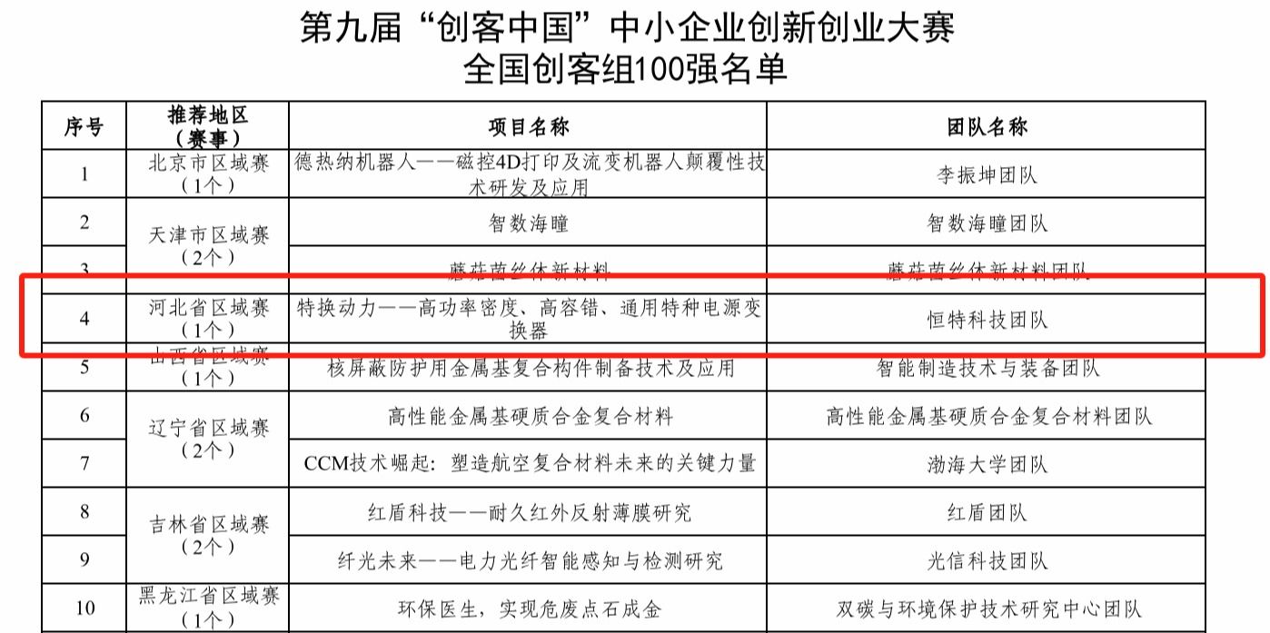 【新闻中心讯】11月6日,工业和信息化部网络安全产业发展中心公布第九届“创客中国”中小企业创新创业大赛全国创客组100强名单,我校恒特科技团队参赛项目“特换动力—高功率密度、高容错、通用特种电源变换器”成功入选全国创客组100强,这是河北省唯一进入全国创客组100强的项目,也是我校参加该赛事以来取得的最好成绩。