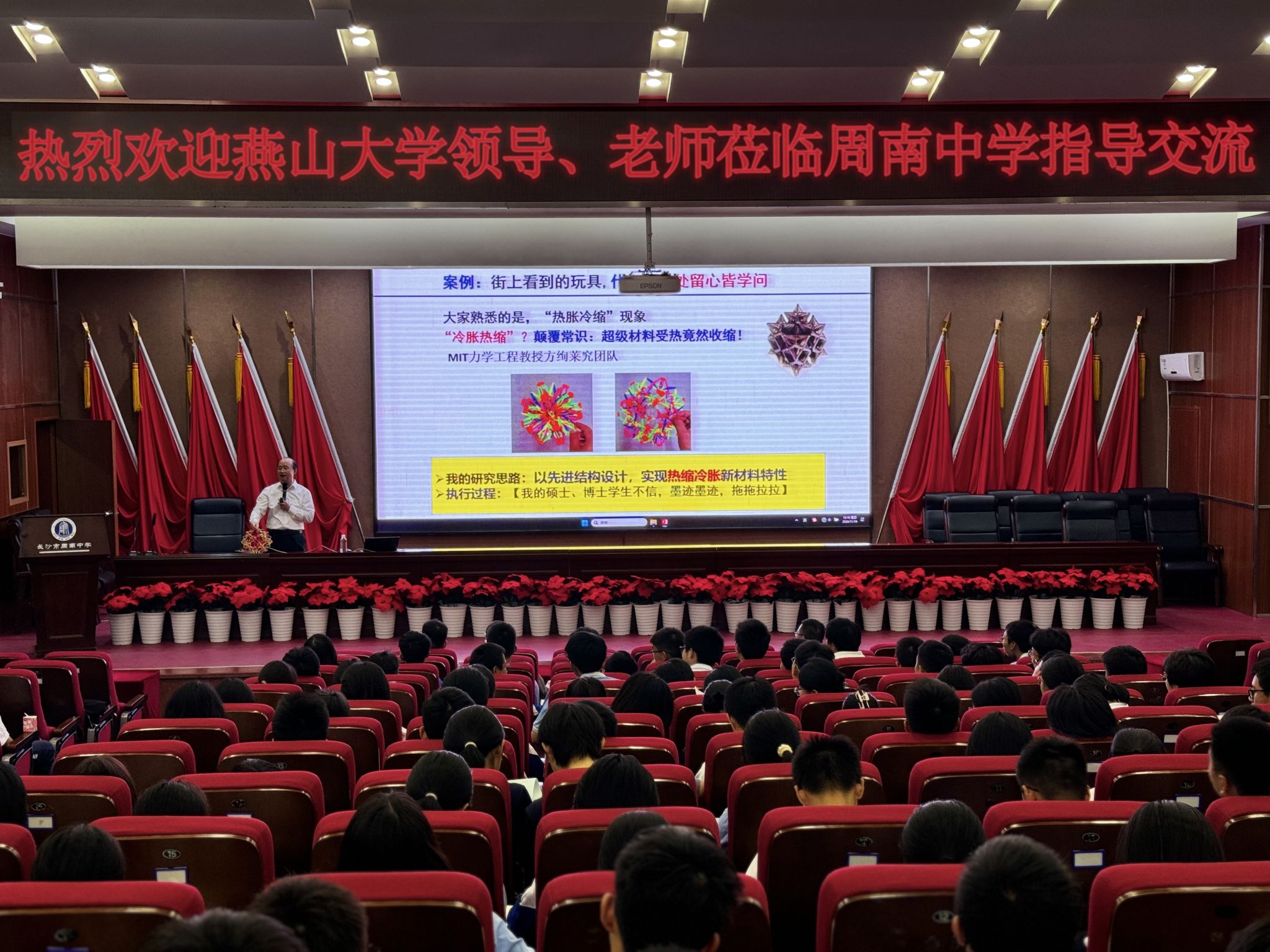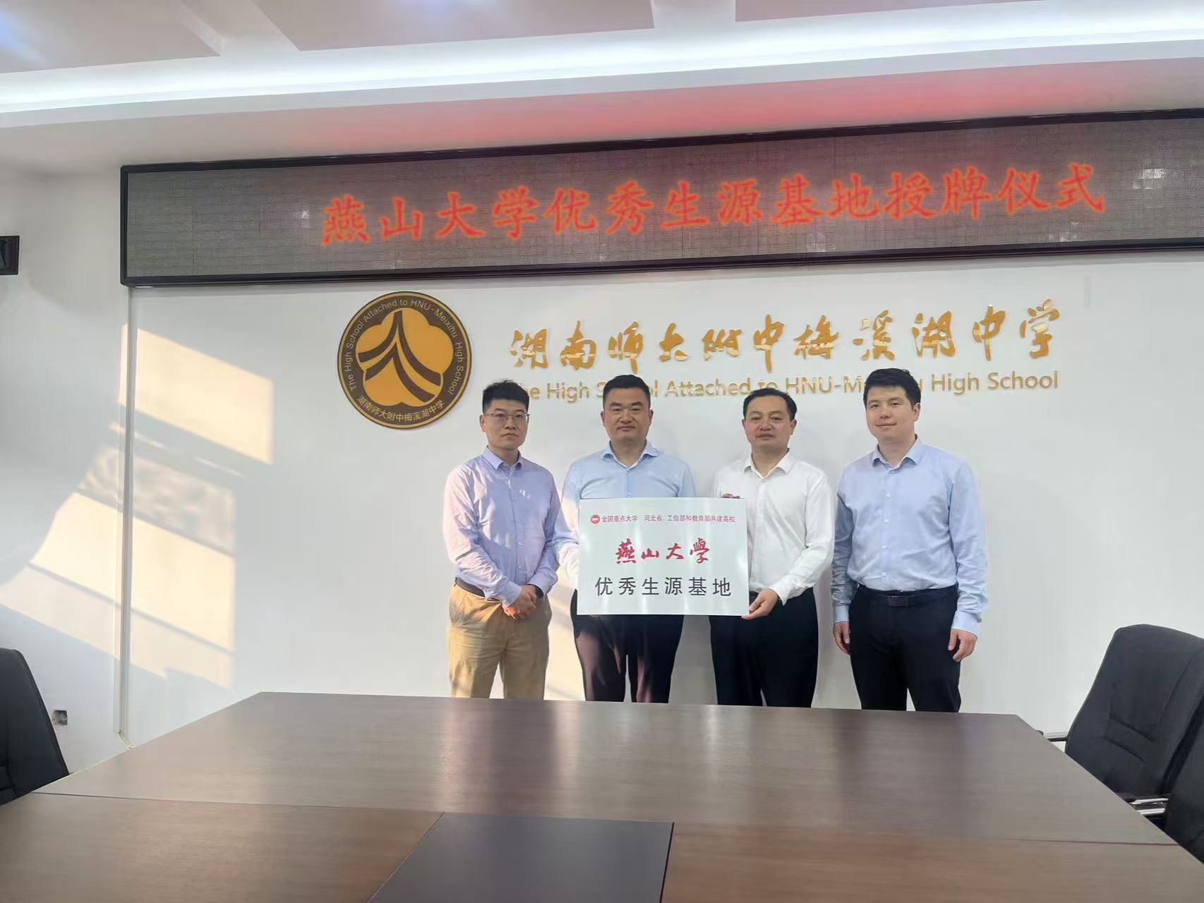 走访高中期间,文桂林一行先后走访了长沙市周南中学和湖南师大附中梅溪湖中学,与两所中学的学校领导、骨干教师进行了座谈交流,并向中学授予“优秀生源基地”牌匾。在座谈会上,文桂林首先介绍了学校的历史沿革、人才培养和近几年在湖南省的招生录取情况,同时交流了近年被我校录取的周南中学和梅溪湖中学学生的学习近况。在周南中学,文桂林以《挖掘知识的原力矿,让优秀成为习惯》为题和中学生分享读好书的乐趣以及知识驱动科技创新的力量与激情,同时详细介绍了燕山大学的基本情况,会场掌声频频、反响热烈。