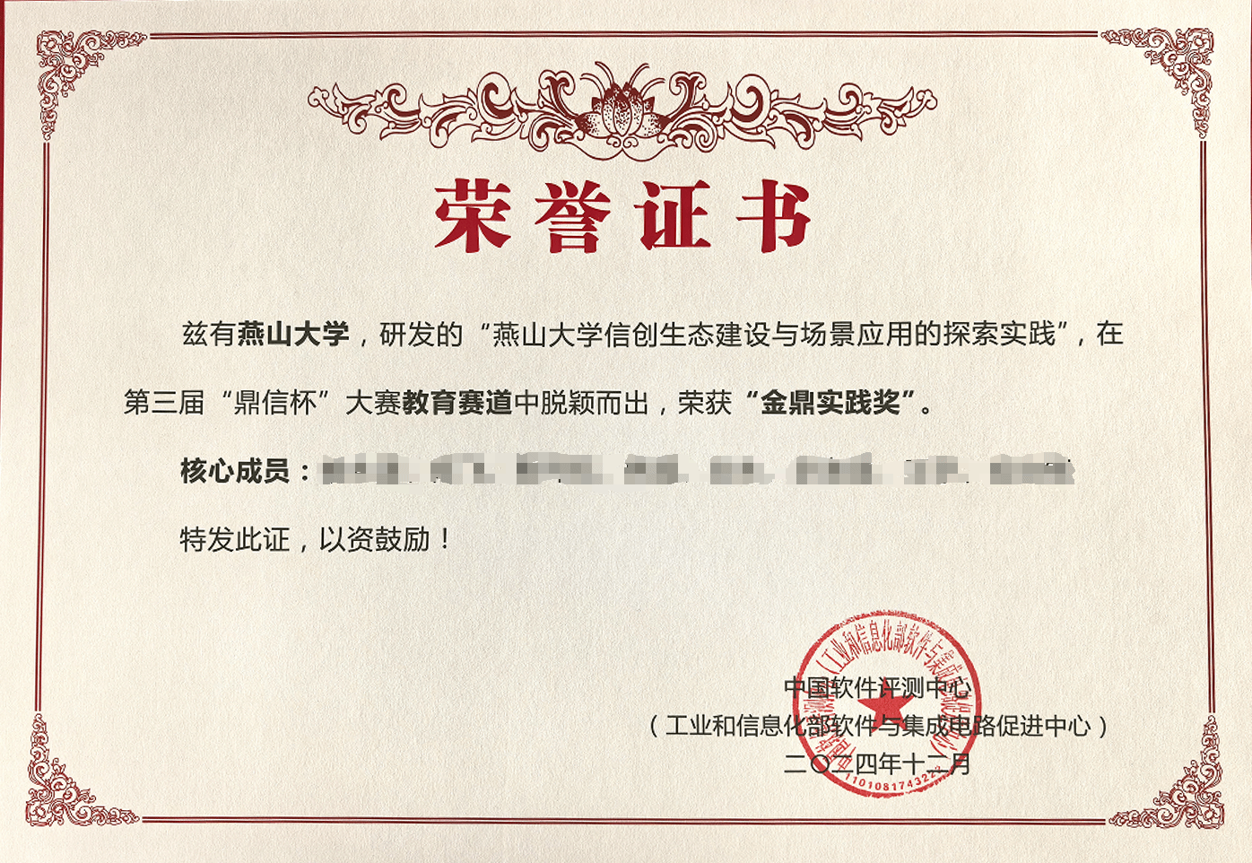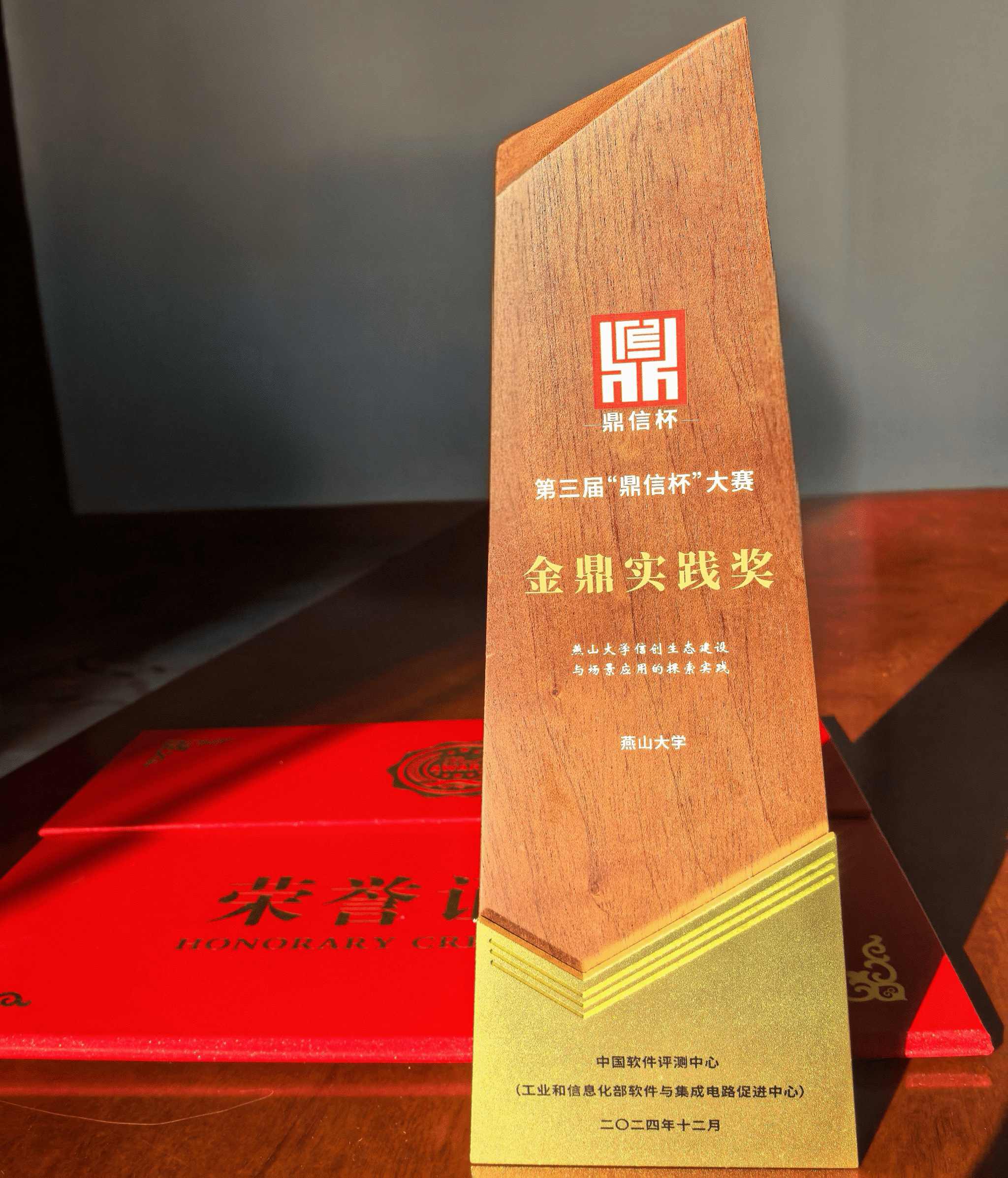 【新闻中心讯】12月25日,由中国软件评测中心(工业和信息化部软件与集成电路促进中心)主办的第三届“鼎信杯”颁奖仪式在北京召开。我校参赛的《燕山大学信创生态建设与场景应用的探索实践》经过初审、复赛、总决赛等多个环节的激烈角逐,最终荣获第三届“鼎信杯”教育赛道金鼎实践奖。
