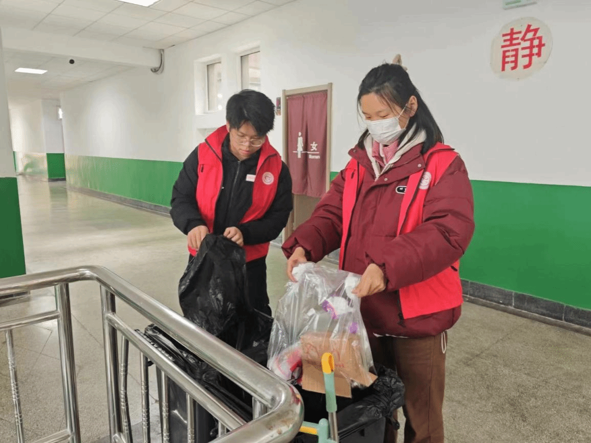 志愿者活跃在教学区、宿舍楼等区域,清理垃圾、摆放自行车、美化环境,为师生营造整洁舒适的生活空间,为建设美丽校园贡献力量;制作爱心花束赠与食堂工作人员及安保人员,让雷锋精神在双向奔赴中焕发温度。