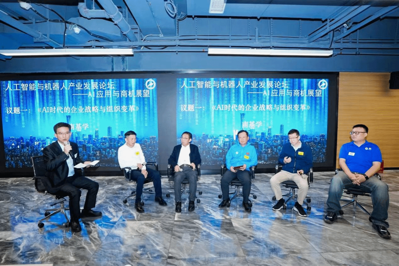 活动下半场为圆桌讨论。此环节由深圳市清溢光电控股子公司清溢微电子副总经理陶飞主持,并邀请电子旭辉资产管理公司董事长蒋顺才、深圳智能终端协会执行会长安自能、广东烨嘉科技集团董事长南基学、深圳市汇川技术股份有限公司副总裁付作军和芯洲科技(北京)股份有限公司销售总监李卓识五位拥有丰富实战经验的校友,结合自己的实际案例,就AI时代背景下政府政策及产业发展、企业应如何调整战略、如何进行组织变革等议题展开热烈讨论,并从地域、行业、产业协同发展等维度进行深入交流。