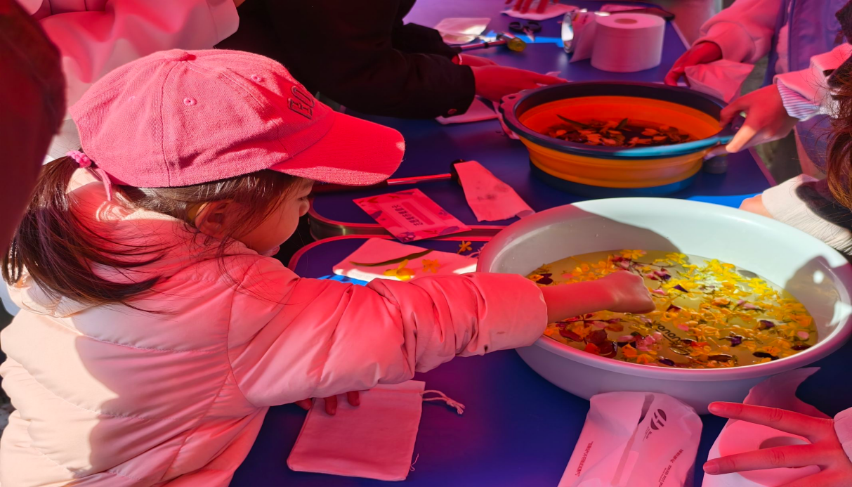 公益体验区将传统文化与志愿服务碰撞出独特火花。手工艺坊的绳编教学区汇聚众多师生,一根根红绳在指尖穿梭,编织出象征祝福的中国结;经济管理学院筑梦青年志愿者协会现场演示漆扇制作,展示非遗魅力;艺术与设计学院青协发挥专业优势,为师生绘制简约肖像,以线条勾勒笑容,用海娜手绘描绘祝福图腾;环境化学与工程学院绿色先锋青协开展植物拓印体验,带领参与者以布为纸、以叶为墨,将春日草木定格为永恒的艺术品,让公益实践化身一场文化传承之旅。