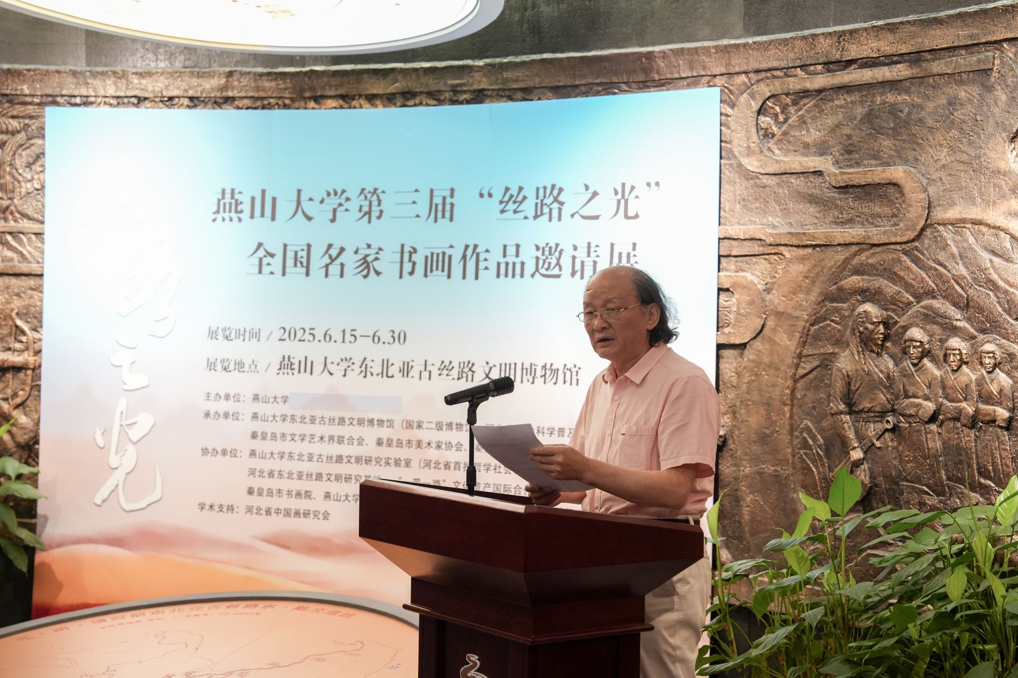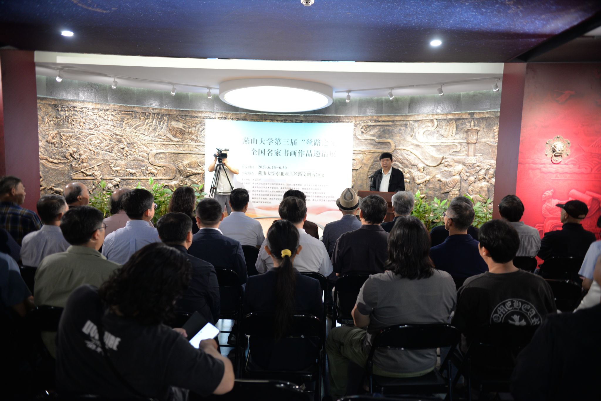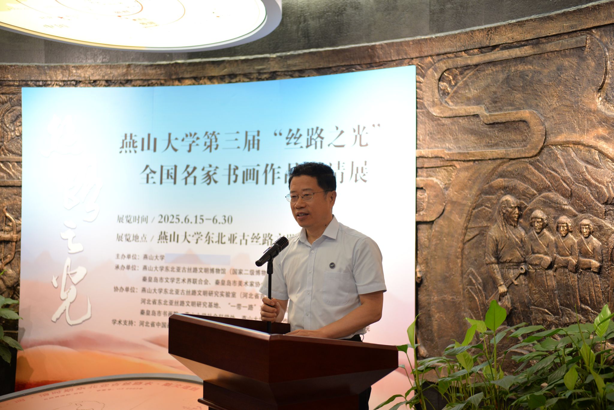 【新闻中心讯】6月15日,燕山大学第三届“丝路之光”全国名家书画作品邀请展在东北亚古丝路文明博物馆开幕,以艺术力量助力文化强国建设,以书画形式绘就时代之美。河北省美术家协会原副主席、河北省中国画研究会会长、一级美术师汉风,国家民族画院原副院长、北京市文史研究馆馆员、一级美术师郑山麓,原海军政治部创作员、中国国家画院研究员、一级美术师吴建科,秦皇岛市委常委、宣传部长刘丽香,市文联党组书记、主席王海东,市文联三级调研员孙世辉,市文联副主席刘锦堂,市美术家协会主席宋鸿钧,市书法家协会主席、书画院院长乔海光及参展书画家代表受邀莅临开展仪式。燕山大学党委书记赵险峰,党委常委、副校长李春玲以及学校相关学院和职能部门负责同志出席活动。活动由东北亚古丝路文明博物馆馆长邓树平主持。