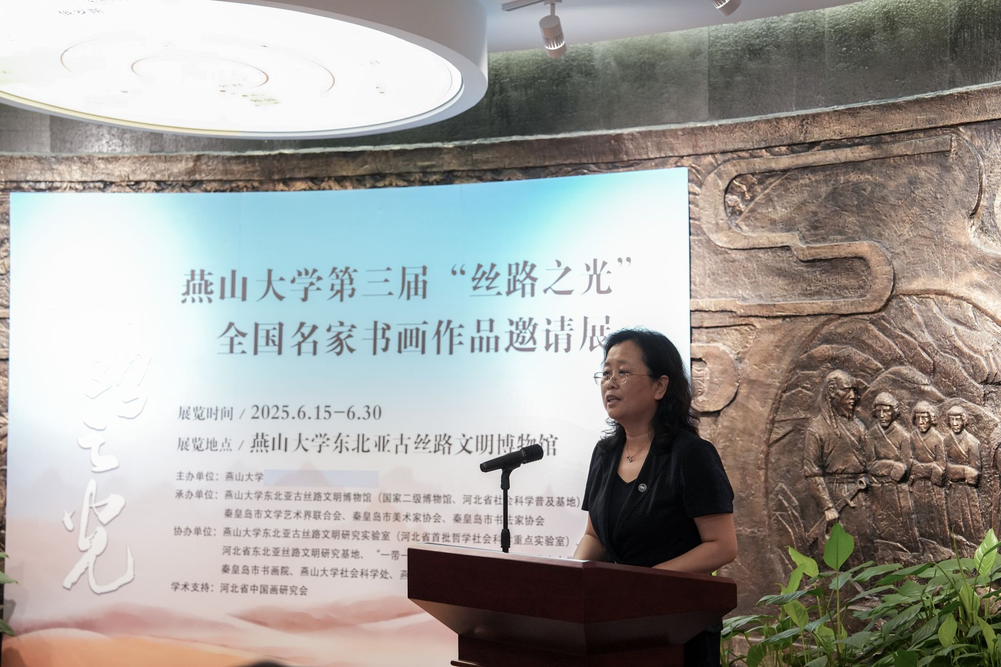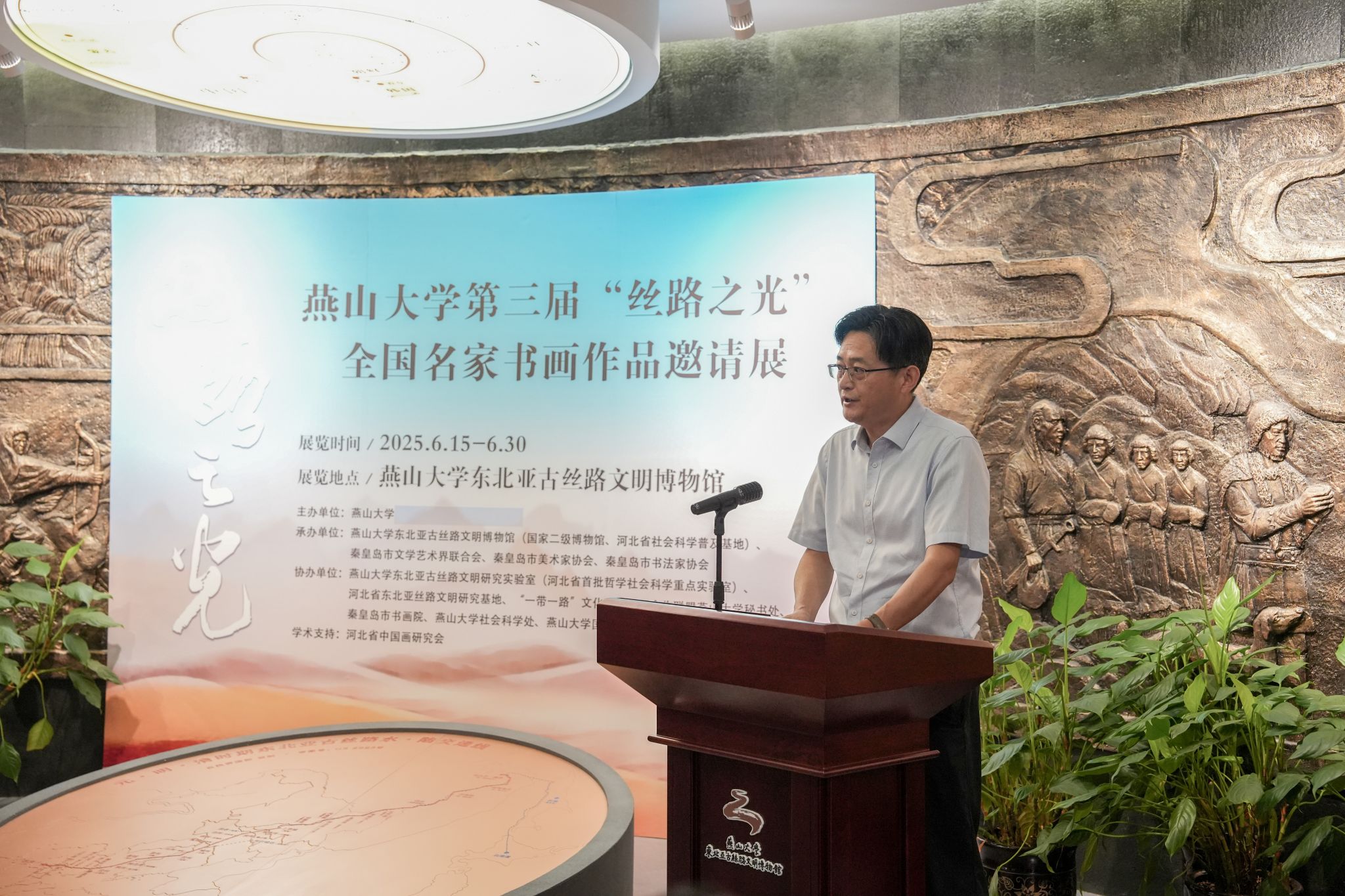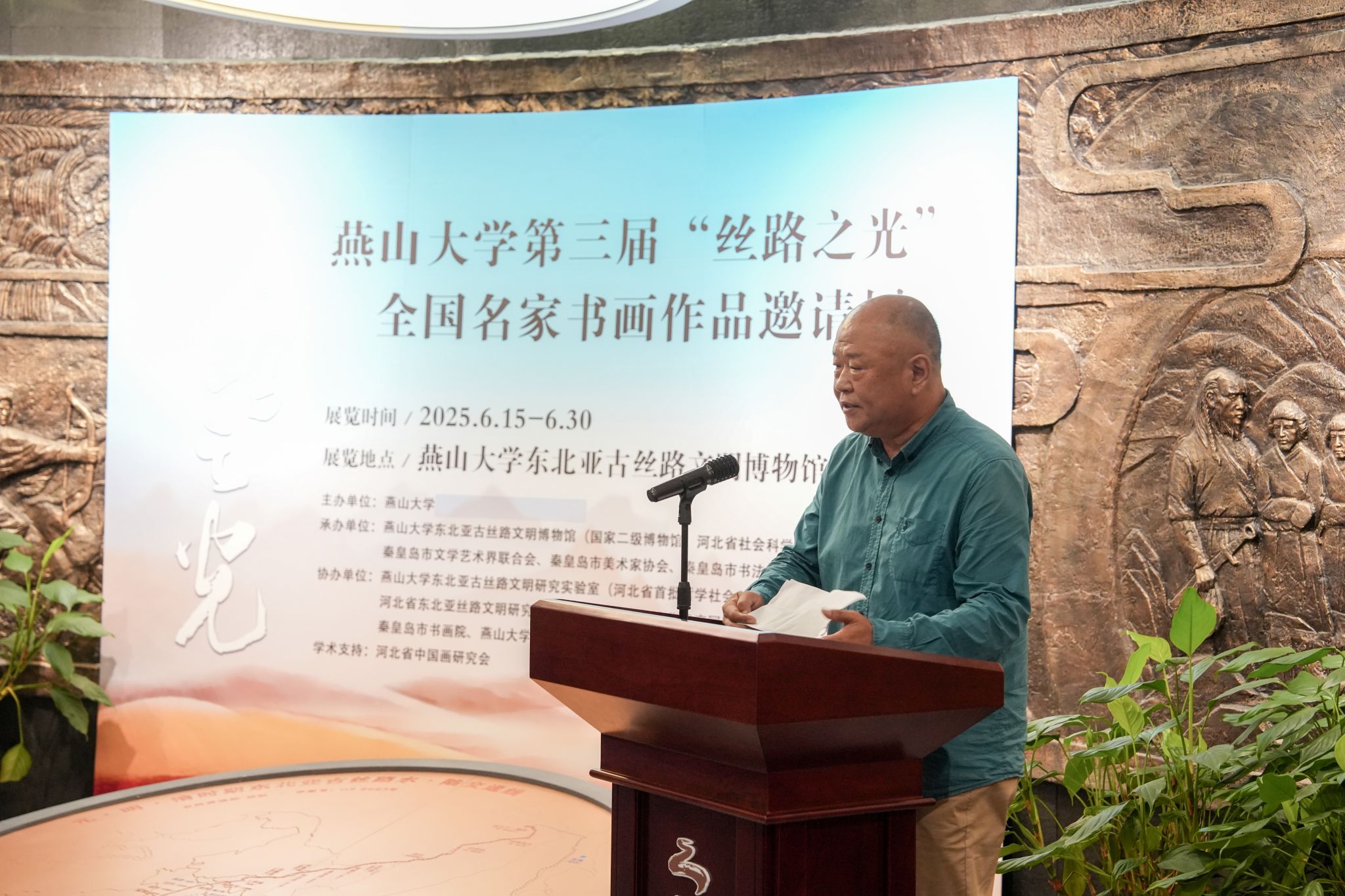 【新闻中心讯】6月15日,燕山大学第三届“丝路之光”全国名家书画作品邀请展在东北亚古丝路文明博物馆开幕,以艺术力量助力文化强国建设,以书画形式绘就时代之美。河北省美术家协会原副主席、河北省中国画研究会会长、一级美术师汉风,国家民族画院原副院长、北京市文史研究馆馆员、一级美术师郑山麓,原海军政治部创作员、中国国家画院研究员、一级美术师吴建科,秦皇岛市委常委、宣传部长刘丽香,市文联党组书记、主席王海东,市文联三级调研员孙世辉,市文联副主席刘锦堂,市美术家协会主席宋鸿钧,市书法家协会主席、书画院院长乔海光及参展书画家代表受邀莅临开展仪式。燕山大学党委书记赵险峰,党委常委、副校长李春玲以及学校相关学院和职能部门负责同志出席活动。活动由东北亚古丝路文明博物馆馆长邓树平主持。