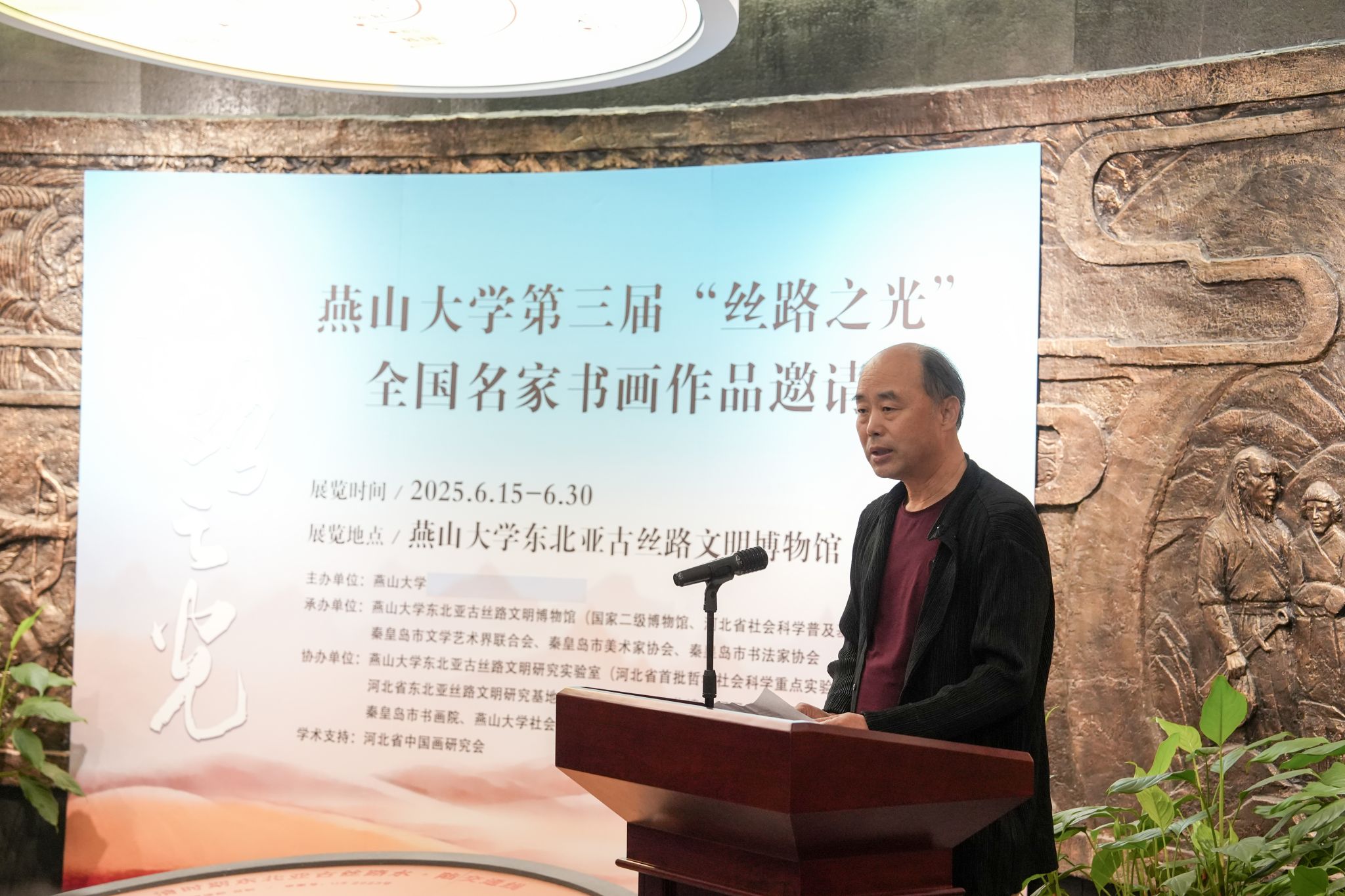 郑山麓对受邀参展的部分书画家和创作过程进行了介绍,表示此次展览为广大艺术家提供了以“东北亚古丝路文化”为主题的创作思路和创作题材。