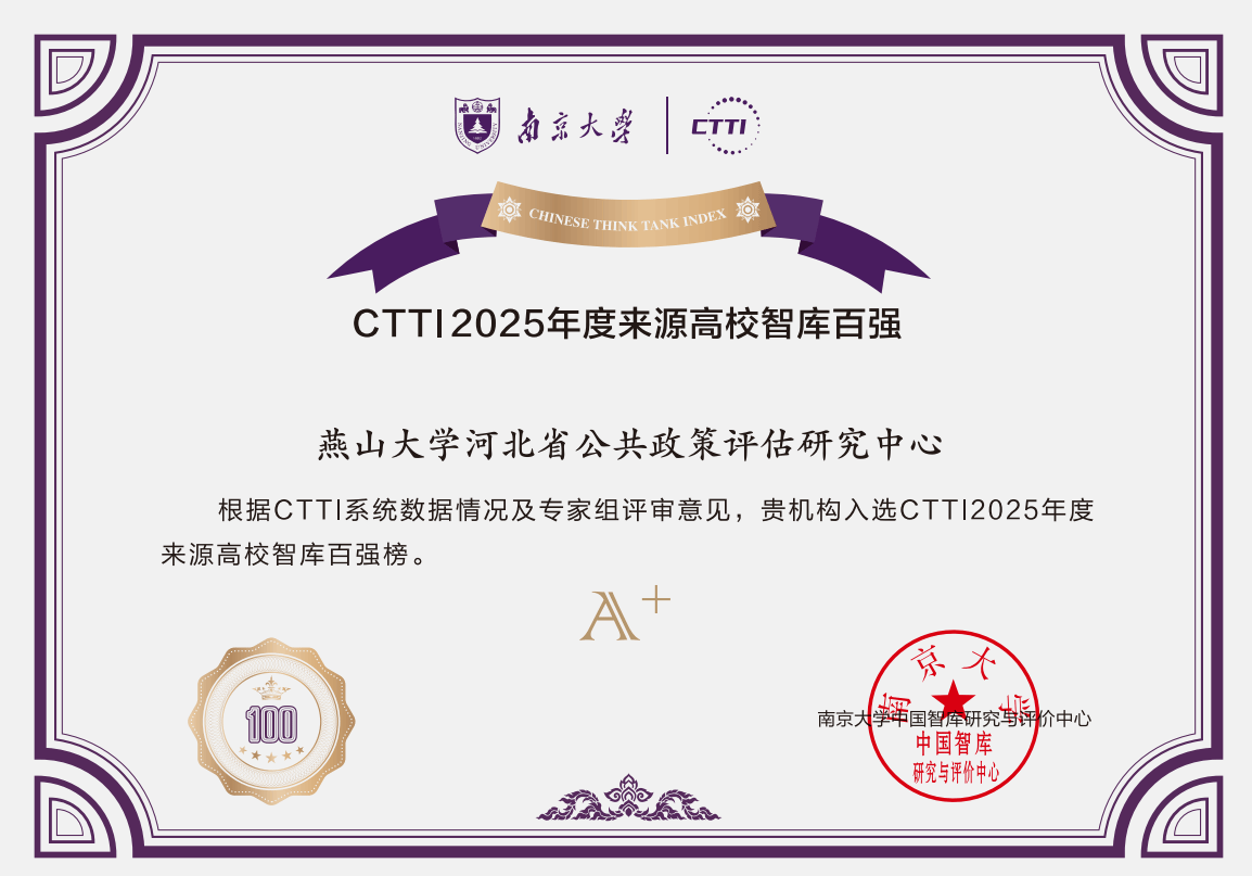 南京大学中国智库研究与评价中心于2025年9月依托CTTI系统内810家高校智库的数据启动了CTTI年度来源高校智库百强榜推介工作。经CTTI系统核算,因存在分数并列,共有131家高校智库进入专家评审环节。根据系统分数以及专家评分,综合得出各家高校智库的“PAI‒E”值,由此确定百强榜最终名单。本年度高校智库百强榜推介结果分为三类,A+等级高校智库40家,A等级高校智库60家,提名等级高校智库31家。该榜单迄今共发布三次,燕山大学河北省公共政策评估研究中心均荣誉入围:2018年为A等级,2022年为A等级,2025年为A+等级。