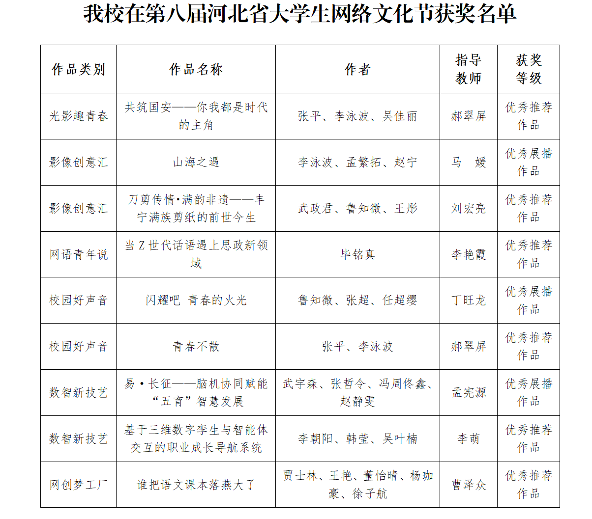 【新闻中心讯】近日,河北省教育厅、中共河北省委网信办公布了第八届河北省大学生网络文化节和高校网络教育优秀作品推选展示活动遴选结果,我校22项优秀作品获奖。在大学生网络文化节作品评选中,我校获奖作品共计9项;在高校网络教育优秀作品评选中,我校获奖作品共计13项。燕山大学、河北省高校网络思想政治工作中心获河北省大学生网络文化节和高校网络教育优秀作品推选展示活动优秀组织奖。