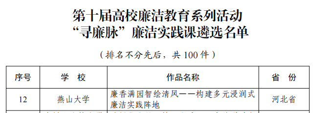 此次入选,不仅彰显了我校在廉洁教育领域的积极探索与创新实践,更充分展现了全校师生崇廉尚洁的精神风貌,是学校推进廉洁文化建设的重要成果。学校将以此为契机,深入贯彻落实新时代廉洁文化建设三年行动计划,把廉洁教育贯穿办学治校、教书育人、立德修身始终,聚力打造“廉韵燕园”文化建设品牌,持续深化清廉校园建设,维护巩固风清气正的育人生态,为学校事业高质量发展提供坚强保障。(编辑 魏欣宇)
