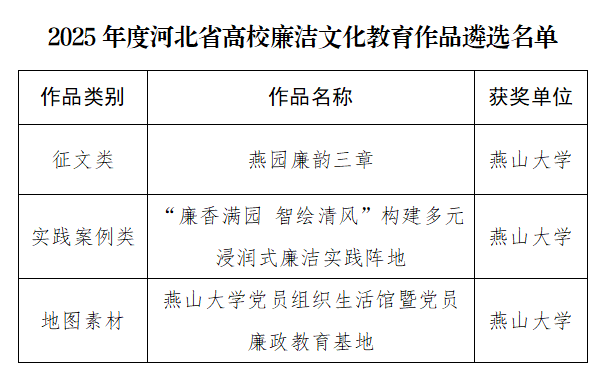 【新闻中心讯】近日,河北省委教育工委公布了2025年河北省高校廉洁文化教育活动评选结果,我校电气工程学院选送的征文《燕园廉韵三章》,纪委办公室的实践案例《廉香满园智绘清风——构建多元浸润式廉洁实践阵地》和党委组织部选送的廉洁文化地图素材《燕山大学党员组织生活馆暨党员廉政教育基地》等3项作品成功入选河北省2025年度高校廉洁文化教育作品遴选名单。