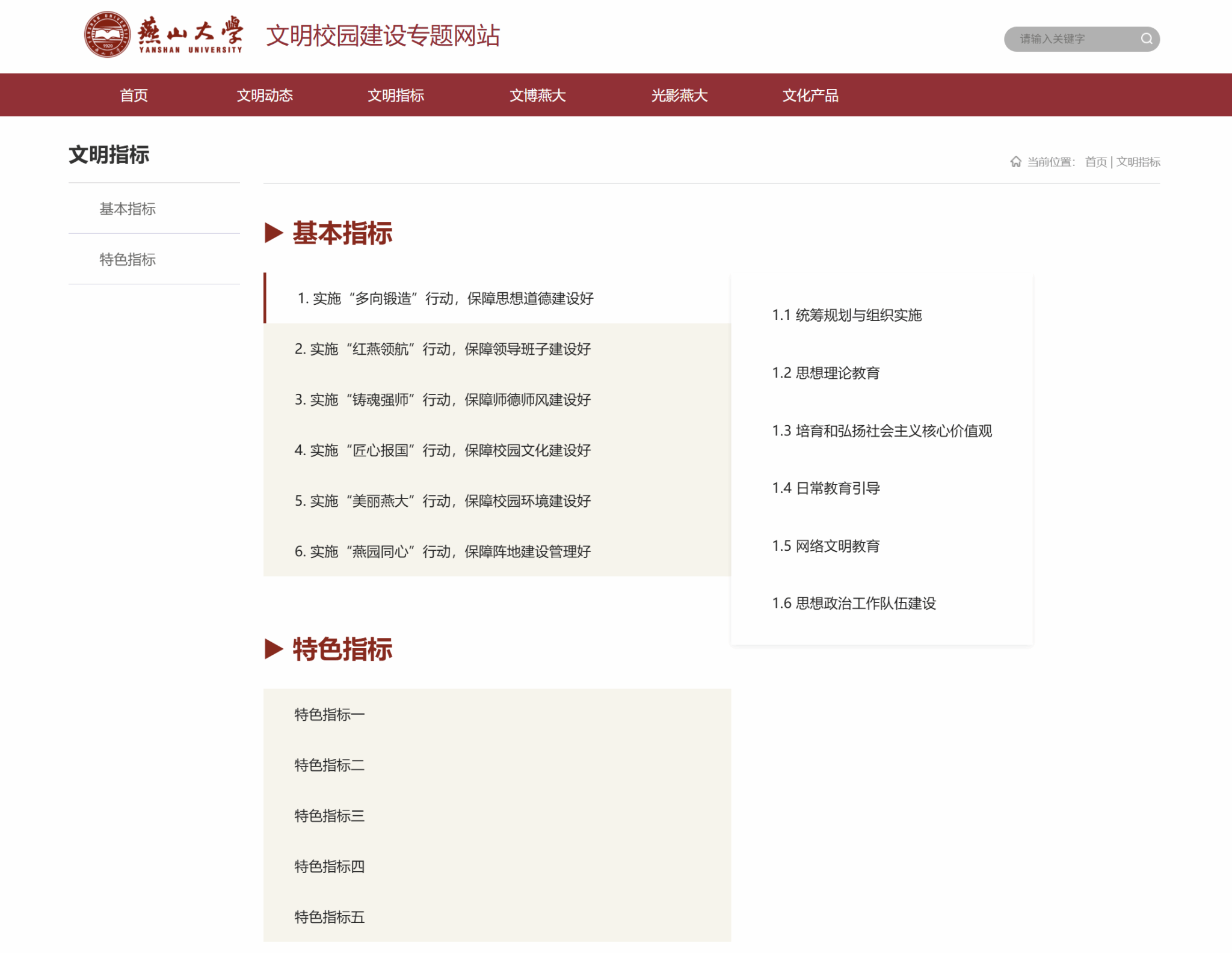 网站紧扣文明校园建设核心任务,精心设置“文明动态”“文明指标”“文博燕大”“光影燕大”“文化产品”五个一级栏目。其中,“文明动态”及时发布创建工作最新消息;“文明指标”对标“六个好”展示任务落实情况;“文博燕大”挖掘校史校情中的文化资源;“光影燕大”用影像记录校园文明瞬间;“文化产品”汇集师生创作的文明主题作品。五大板块各具特色,全方位、多角度展现燕大文明校园建设的生动实践。