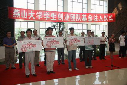 【新闻中心讯】2009年6月17日上午9:50,燕山大学学生创业团队基金注入仪式在西校区大学生活动中心举行。燕山大学校长助理、燕大科技园管理办公室主任、燕大产业集团总经理刘文远,党委宣传部部长白靖,党委办公室副主任甄红军,教务处副处长朱代春,燕大科技园管理办公室副主任张力,燕大科技园管理办公室副主任刘立伟,材料科学与工程学院党委副书记王国伟,电气工程学院党委副书记严冰和里仁学院党委副书记李文波等出席了此次仪式。参加仪式的还有校团委、学工处、教务处、电气学院、信息学院、材料学院等单位和部门的相关负责人,以及被注入资金的各个学生创业团队。