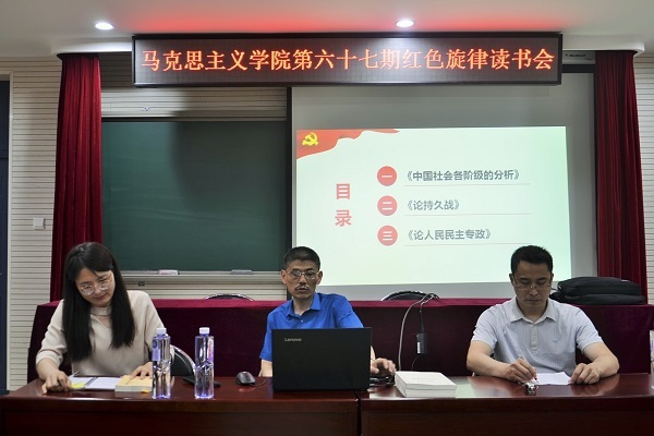 【新闻中心讯】6月17日晚7点,由马克思主义学院主办,马克思主义研究会承办的第六十七期“红色旋律”读书会在我校人文馆M502举行。本期主题是《从经典中汲取智慧——再读<毛泽东选集>》,由马克思主义学院江泉、魏忠强、李小东老师主讲。江泉老师带领同学们解读了《中国社会各阶级的分析》。首先,江老师向同学们介绍了文章的写作背景,指出此文是毛泽东深刻洞察党内外思想动态,总结革命经验教训的理论成果。其次,江老师通过细致剖析文章的主要内容,指出本文论述了中国革命的对象、动力、性质和前途等一系列问题,初步提出了关于新民主主义革命的基本思想。最后,江老师向同学们深刻阐释了文章的当代价值,指出只有正确认识我国社会阶层结构的新变化,才能处理好社会主义现代化建设过程中各阶级、各阶层间的关系,推进社会主义现代化建设宏伟事业。魏忠强老师带领同学们研读了《论持久战》。首先,魏老师鲜明阐释了文章的写作目的,指出文章是对“亡国论”、“速胜论”和“妥协论”等错误论调的批判和驳斥,回应了全国人民关于抗战前途、策略和方式的关切,从而指明了抗日战争的前进方向。其次,魏老师从国力强弱、国家大小、国际援助等方面论述了抗日战争发展的基本规律,指出抗日战争将经历三个阶段,并经过持久抗战中国人民必能取得最后胜利。最后,魏老师深刻阐述了“兵民是胜利之本”,说明民心向背是决定战争胜负的关键性因素,指出在战争中发动群众、依靠群众,才能赢得最终胜利。李小东老师带领同学们研读了《论人民民主专政》。首先,李小东老师向同学们介绍了文章的写作背景,指出此文回击了帝国主义和反动派的质疑,驳斥了在国家政权问题上的各种错误思想和反动观点。其次,李老师指出人民民主专政是在马克思主义国家观的理论指导下进行的探索,是与中国革命具体实践相结合的产物,是中国共产党在革命斗争中的伟大创造,丰富了马克思主义的国家学说。最后,李老师通过细致分析人民民主专政的内涵、基础与前景,告诫同学们只有始终坚持中国共产党领导,始终坚持人民民主专政制度,中国民主建设才能发展得更好,中国才能走向繁荣富强。
