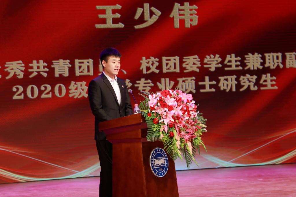 在校生代表王少伟发言,他讲述了在学院的成长过程,表示要在文法学院宽广的胸怀中,树立起执着一生的理想、积攒起展翅腾飞的力量。