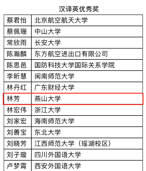 【新闻中心讯】10月21日,在第三十三届韩素音国际翻译大赛中,燕山大学外国语学院2019级英语笔译专业研究生林芳喜获汉译英组优秀奖。