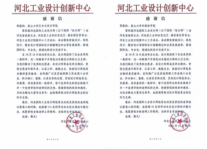 【新闻中心讯】近日,河北省工业设计创新中心专门致函我校,对第四届河北国际工业设计周期间我校艺术与设计学院和外国语学院3名教师和146名学生的志愿服务工作给予高度评价,并向参与此项工作的师生表示感谢。