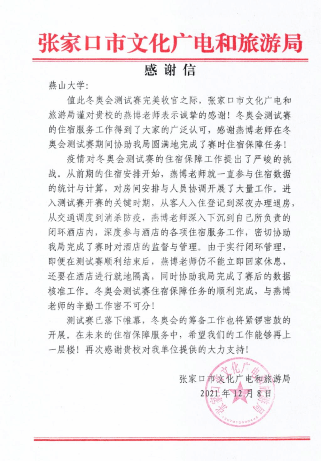 【新闻中心讯】近日,燕山大学收到一封来自张家口市文化广电和旅游局的感谢信。信中对我校建筑工程与力学学院辅导员燕博老师在冬奥会系列测试赛期间协助张家口市文化广电和旅游局圆满完成赛时住宿保障任务表示感谢。