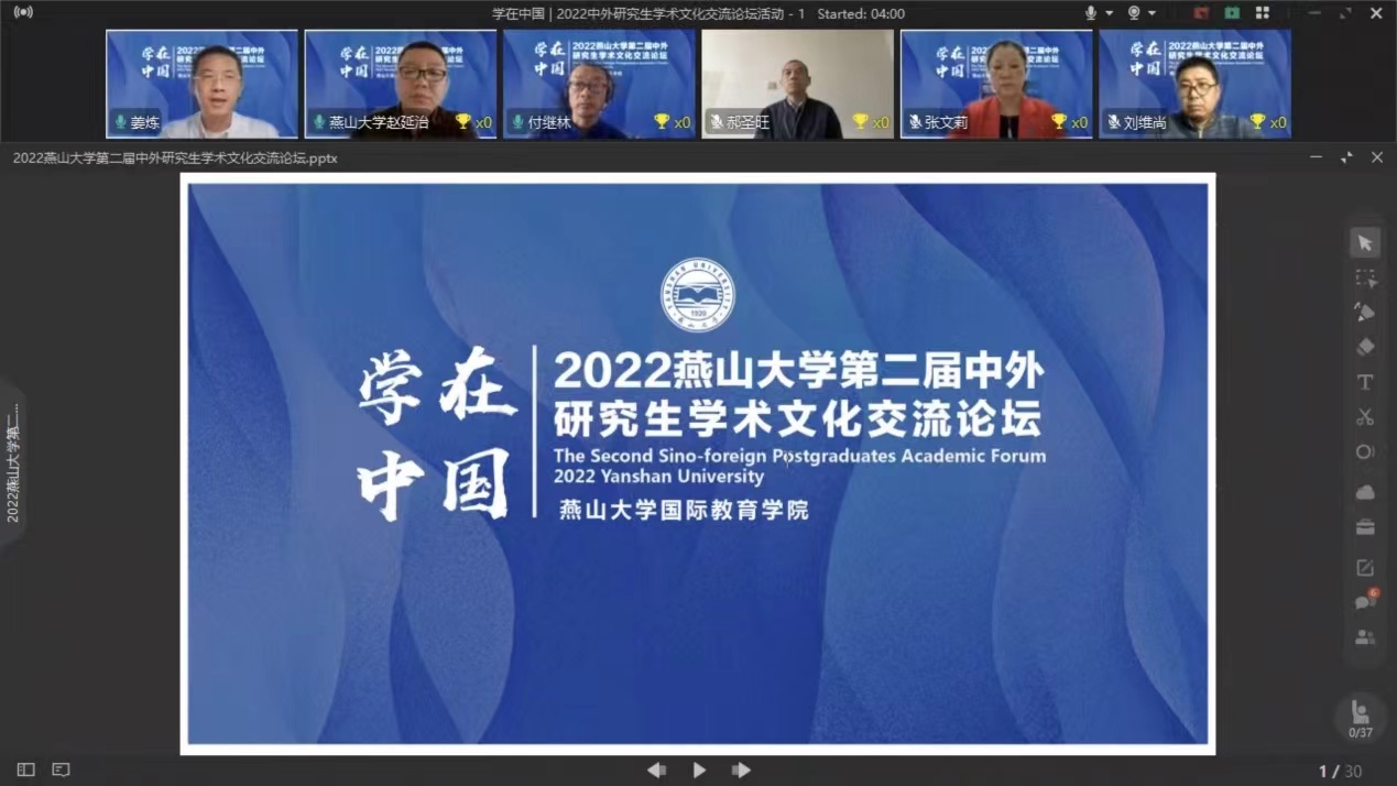 【新闻中心讯】4月28日下午,“学在中国∙2022燕山大学中外研究生乐竞体育在线文化交流论坛”通过线上直播方式圆满举行。论坛由国际教育学院主办,研究生院、外国语学院、建筑工程与力学学院、艺术与设计学院相关负责人参加会议。来自三个学院的7名中外研究生受邀在论坛上做乐竞体育在线报告。论坛由国际教育学院副院长姜炼主持。