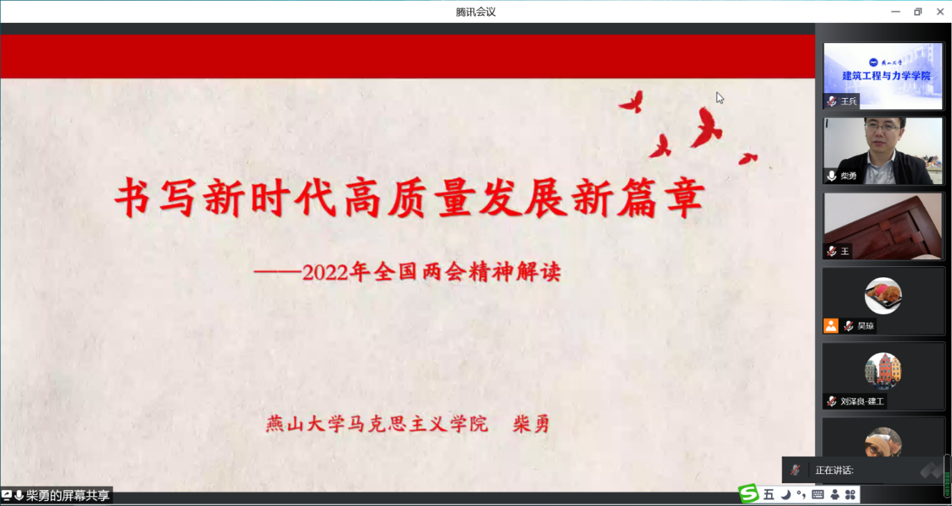 【新闻中心讯】5月20日14:00,建筑工程与力学学院线上举办2022年全国两会精神解读专题辅导讲座。燕山大学党委讲师团成员、马克思主义学院副院长柴勇教授作题为《书写新时代高质量发展新篇章——2022年全国两会精神解读》的辅导报告。全院教职工和研究生党员聆听了讲座,会议由学院党委副书记王兵主持。