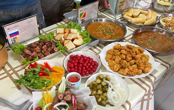 此次美食节着实让人不虚此行,小小的餐桌上聚集了来自世界各地的美食,如:孟加拉国的玛莎拉脆球、巴基斯坦的Pacora、马达加斯加的Romazava、土库曼斯坦的Palov、卢旺达的花生鸡酱、阿尔及内亚的Csecsu、俄罗斯的卡巴烤肉等等近20种国际美食。让人大开眼界、大饱口福!来自阿尔及利亚的萨米同学说:很开心能够邀请这么多的老师和同学们来参加此次美食节,虽然准备地很辛苦,但是看到每个人的脸上都带着笑脸,我们就很开心!